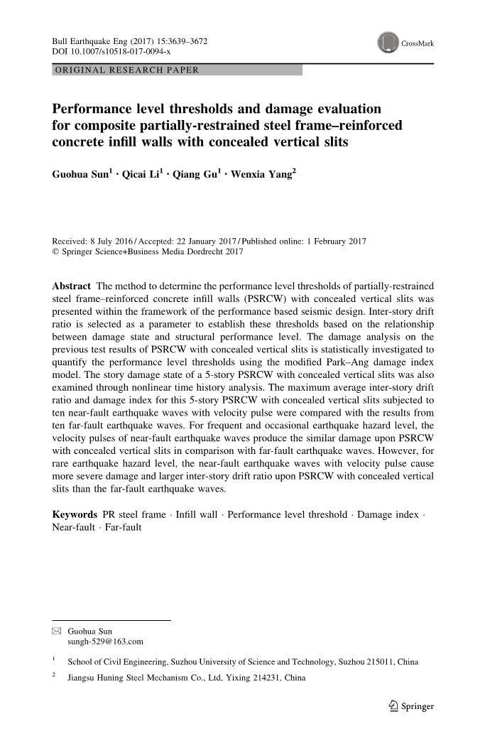 本研究的主要目的是对带暗竖缝的PSRCW结构的性能水平限值进行量化,并对不同的地震危险性水平下带暗竖缝的PSRCW结构的损伤状态进行评价。基于修正的Park-Ang损伤指数模型,对带暗竖缝的PSRCW结构的前期试验结果进行统计分析,推导出结构性能水平限值。此外,本文还对5层带暗竖缝的PSRCW结构在近断层和远断层地震波作用下的非线性时程进行了分析。摘要研究了近断层地震波与远断层地震波的速度脉冲效应对5层带暗竖缝的PSRCW结构动力响应和地震损伤的影响。