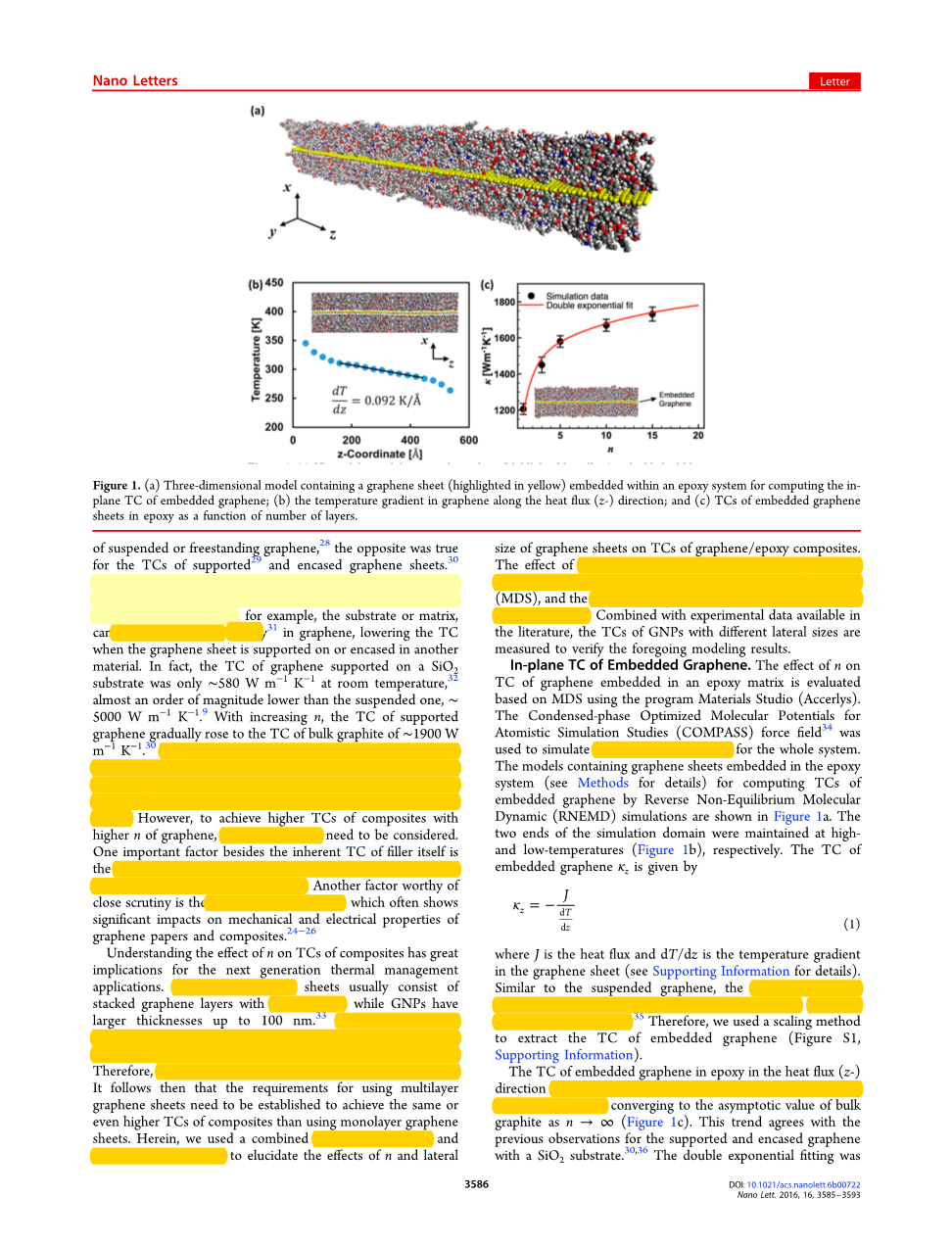 分子动力学模拟使用程序材料工作软件(Accerlys)预估了层数对于石墨烯/环氧树脂复合材料热传导率的影响,利用原子模拟研究(COMPASS)力场中的凝聚相优化分子势来模拟整个系统的原子间相互作用,通过反向非平衡分子动力学(RNEMD)模拟计算包含石墨烯片的嵌入式石墨烯环氧体系的热传导率的模型。仿真域的两端分别在高温和低温下维持。嵌入石墨烯的热传导系数是由下式给出: