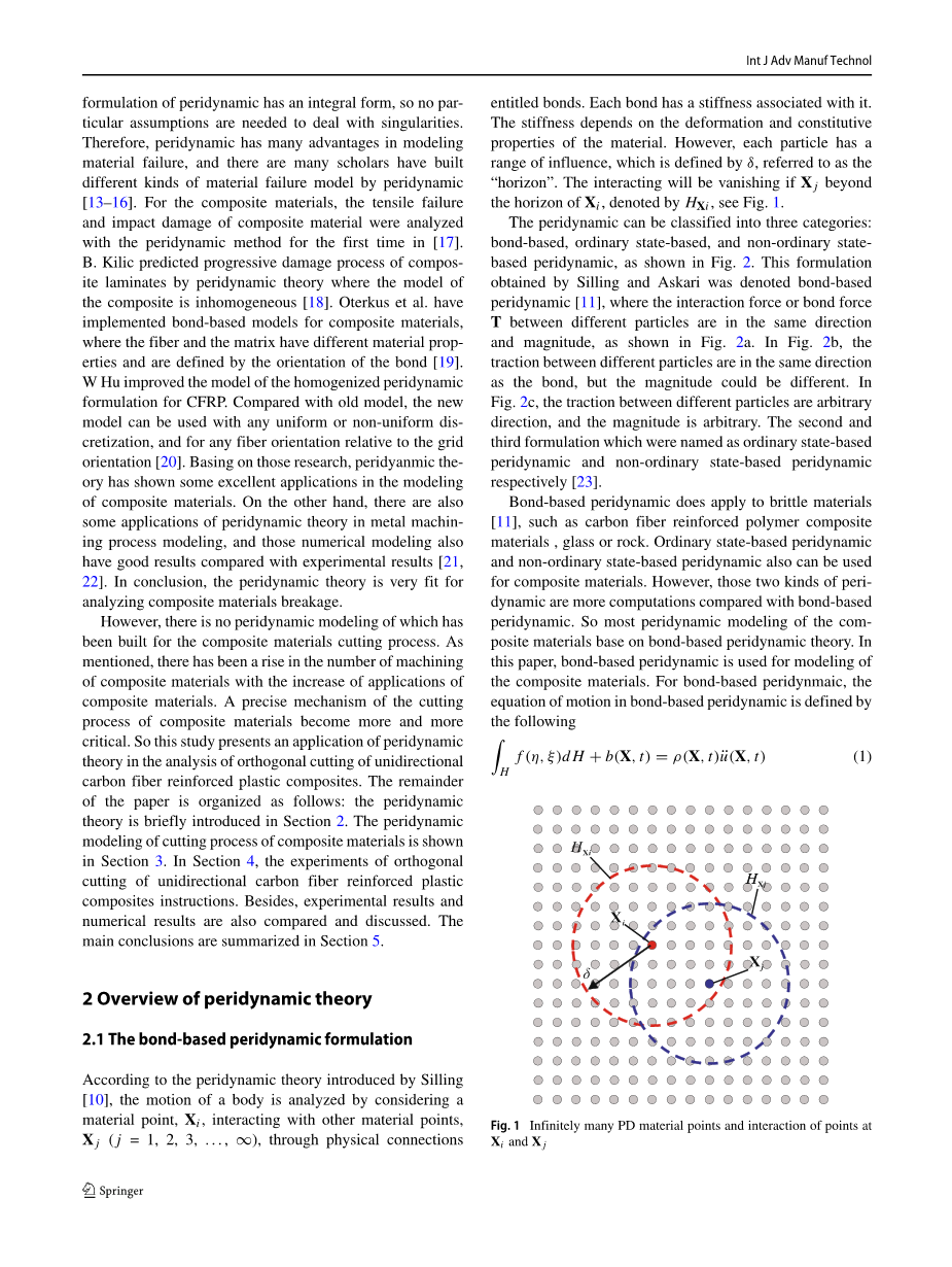 Kilic通过peridynamic理论预测复合材料层合板的渐进损伤过程,其中复合材料的模型是不均匀的[18].Oterkus等人。已经实现了复合材料的基于键合的模型,其中纤维和基质具有不同的材料特性并且由键的取向限定[19].W Hu改进了用于CFRP的均质化peridynamic配方的模型。与旧模型相比,新模型可以与任何均匀或非均匀离散化一起使用,并且对于任何相对于网格方向的纤维取向[20].基于这些研究,peridyanmic理论已显示出在复合材料建模中的一些优秀应用。另一方面,peridynamic理论在金属加工过程建模中也有一些应用,与实验结果相比,这些数值模拟也有很好的结果[21, 22].总之,peridynamic理论非常适合分析复合材料的破损。