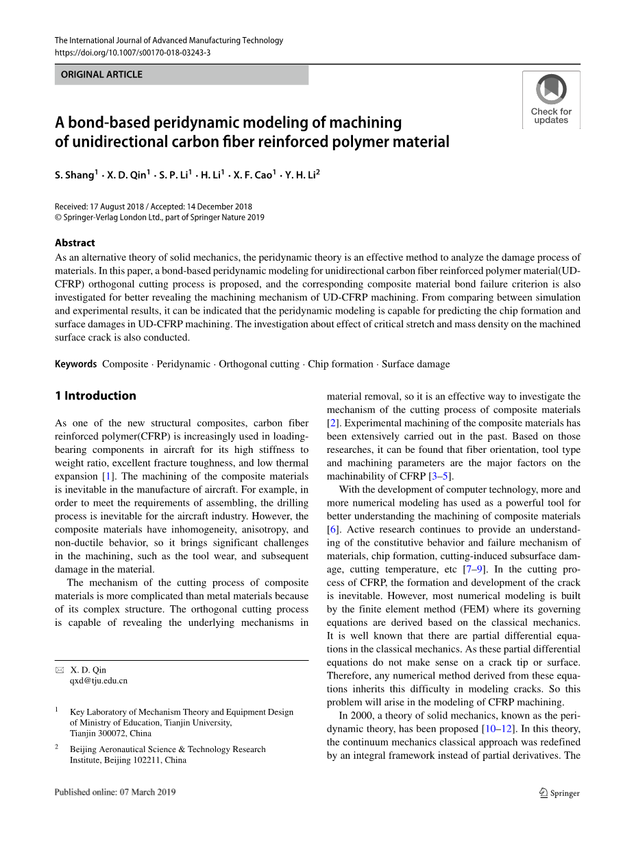 随着计算机技术的发展,越来越多的数值模拟被用作更好地理解复合材料加工的有力工具[6].积极的研究继续提供对材料的本构行为和失效机理,切屑形成,切割引起的次表面损伤,切削温度等的理解[7–9].在CFRP的切割过程中,裂缝的形成和发展是不可避免的。然而,大多数数值模拟是通过有限元方法(FEM)建立的,其中其控制方程是基于经典力学导出的。众所周知,经典力学中存在偏微分方程。由于这些偏微分方程在裂纹尖端或表面上没有意义。因此,任何源自这些方程的数值方法都会在建模裂缝中继承这种困难。因此,在CFRP加工的建模中会出现这个问题。