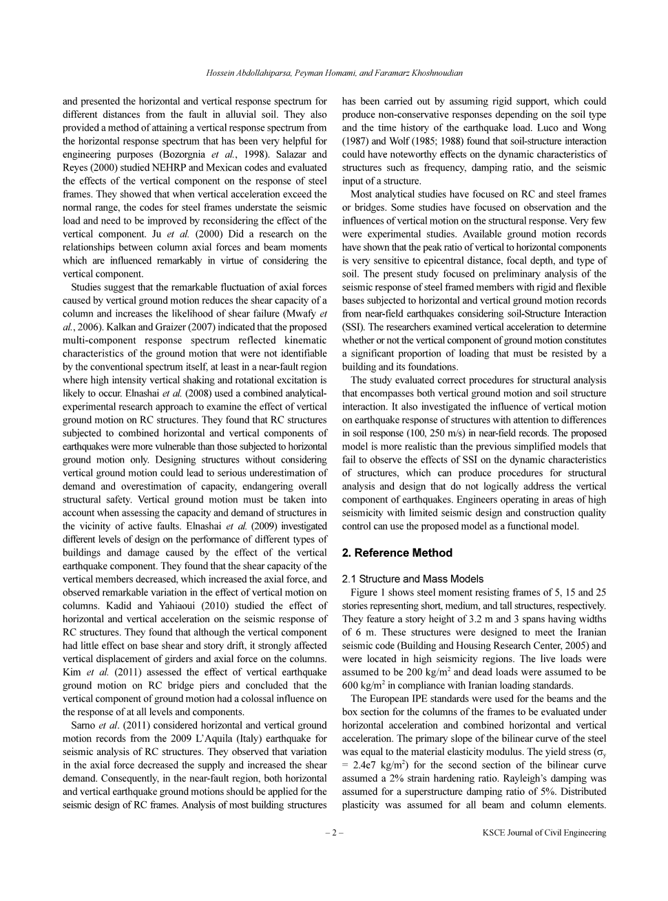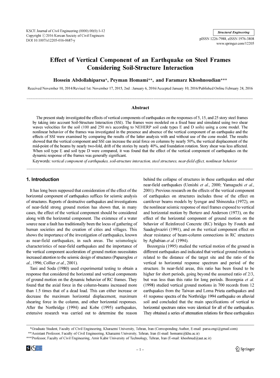 本文考虑土-结构相互作用(SSI),研究了地震垂直分量对5层、15层和25层钢框架结构响应的影响。这些框架是在固定的基础上建模的,并使用锥模型对土壤(根据NEHERP土壤代码类型E和D,分别为100米和250米/秒)的两种剪切波速进行了模拟。研究了框架在地震垂直分量存在和不存在情况下的非线性行为,并通过比较后一种分析结果(有和没有使用锥模型),检验了SSI的影响。结果表明,竖向分量和SSI可使柱轴向力增加近50%,梁中点竖向位移增加近2倍,层间位移增加近40%,基础旋转。层剪力受到的影响较小。当比较土E型和土D型时,发现地震竖向分量对框架动力反应的影响普遍显著。