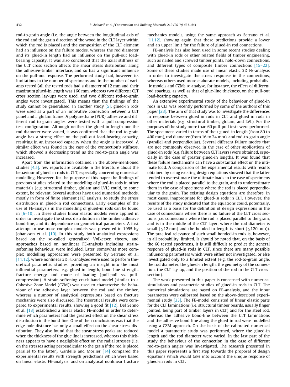 除了在上述研究中获得的信息[4,5],文献中很少有关于CLT中胶合杆的行为的报道,特别是在数值模拟方面。然而,对于本文的目的,以往的研究结果与其他材料(如结构木材、胶合剂和LVL)中胶合棒的建模有关,可能在一定程度上是相关的。一些作者已经使用数值方法,主要是有限元(FE)分析的形式来研究粘接杆连接的应力分布。铁分析用于粘接棒模型的早期例子可以在[6-10]中找到。在这些研究中,采用线性弹性模型来研究木材粘接粘结线的应力分布及其与几何参数的关系。约翰逊等人于1995年首次尝试使用更复杂的模型。在这项研究中,包括了基于广义沃尔克森理论的解析表达式,以及基于非线性铁分析(包括应变软化行为)的方法。随后,Serrano等人提出了较为复杂的建模方法[11,12],其中使用非线性三维铁分析进行理论参数研究,提供了对最具影响力参数的洞察;例如胶合长度、粘结线强度、断裂能和加载方式(拉拔与拉压)。采用应变软化裂纹带模型(类似于粘聚带模型(CZM))来表征杆与木材之间粘接层的行为,并讨论了基于断裂力学的若干解析表达式。将理论计算结果与实验结果进行了比较,结果表明bb0与实验值吻合较好。Del Senno等人建立了线性弹性有限元模型,以确定哪些参数对键合线剪切应力分布影响最大。他们的结论之一是,边孔距离对剪切应力分布的影响很小。他们还发现,当胶线厚度增加时,剪切应力峰值降低,而这种厚度对径向应力的影响似乎可以忽略不计(即当杆平行于晶粒时,垂直于晶粒的应力)。Gardelle和Morlier[14]将实验结果与基于线性弹性铁分析和分析非线性断裂的强度预测进行了比较