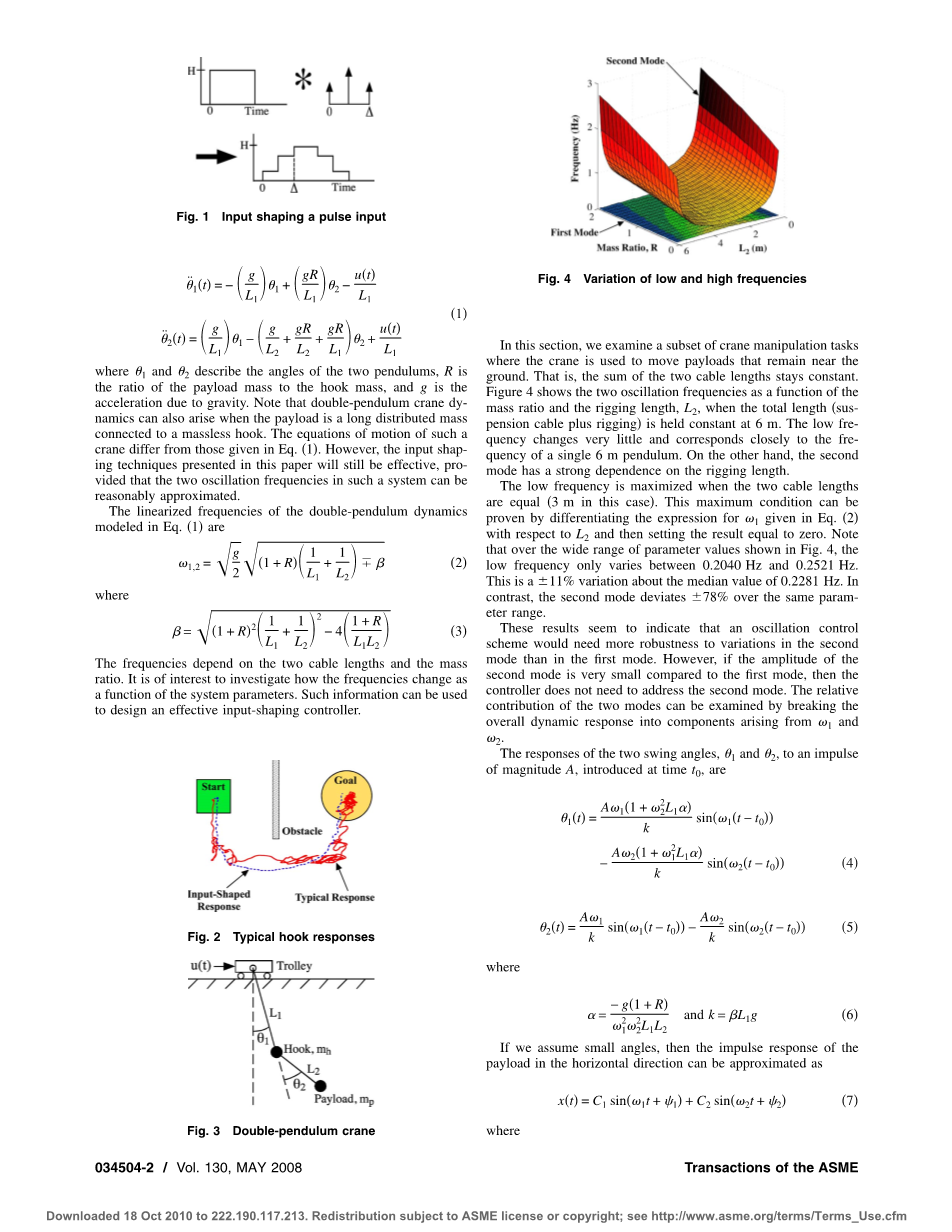 当第二个模式可能导致有效载荷振荡超过可接受的水平,那么它必须考虑到设计输入整形时。有一些设计模输入塑造的方法。在本节中,技术开发直接针对预测的两个频率双摆起重机。以确定输入整形脉冲的振幅和时间地点,制定一组约束方程,然后达到满意。
