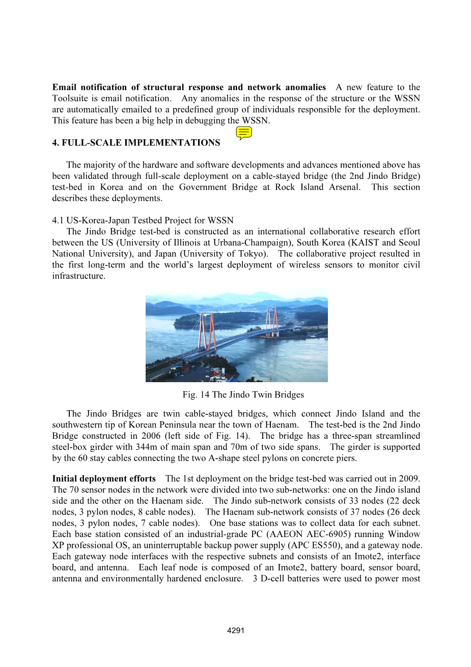 通过斜拉桥(第二珍岛桥)在韩国试验台和政府的桥梁岩岛阿森纳全面的部署,大多数上述硬件和软件的发展和进步已经被证实。本节将为大家描述这些部署工作。