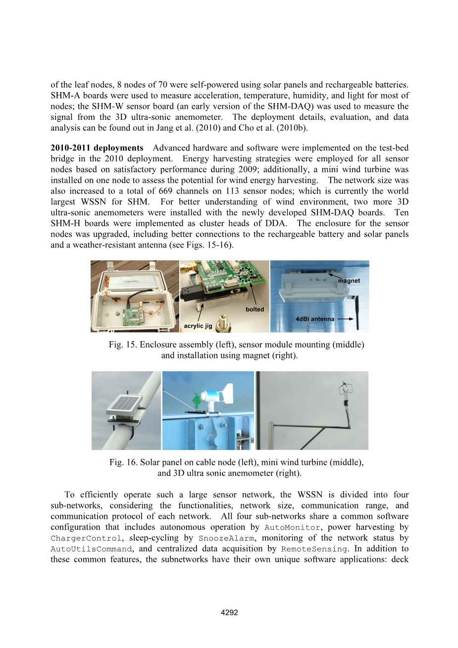 2010 - 2011年的部署 先进的硬件和软件上使试验台大桥在2010年得以成功部署。在2009年,能量收获策略由于让人满意的性能被应用于所有的传感器节点;此外,一个小型风力涡轮机是通过安装一个节点来评估潜在的风能收益。对于目前世界上最大的国际合作项目无线智能传感器网络,网络规模在113传感器节点中也增加到了669个频道。为更好地理解风力环境,两个3D超声波风速计正在运用新开发的SHM-DAQ板来安装。10个SHM-H委员会被任命为DDA的组长。传感器节点是升级的外壳,能够更好的来连接可充电电池,太阳能电池板和抗风化的天线(参见图15和16)。