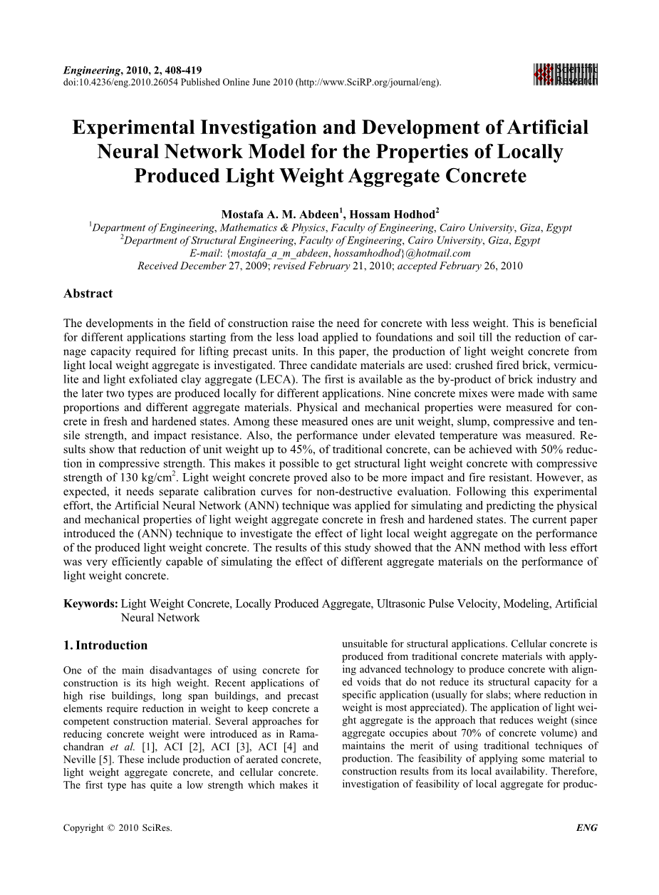 关键词:轻质混凝土,局部生产骨料,超声波脉冲速度,建模,人工神经网络
