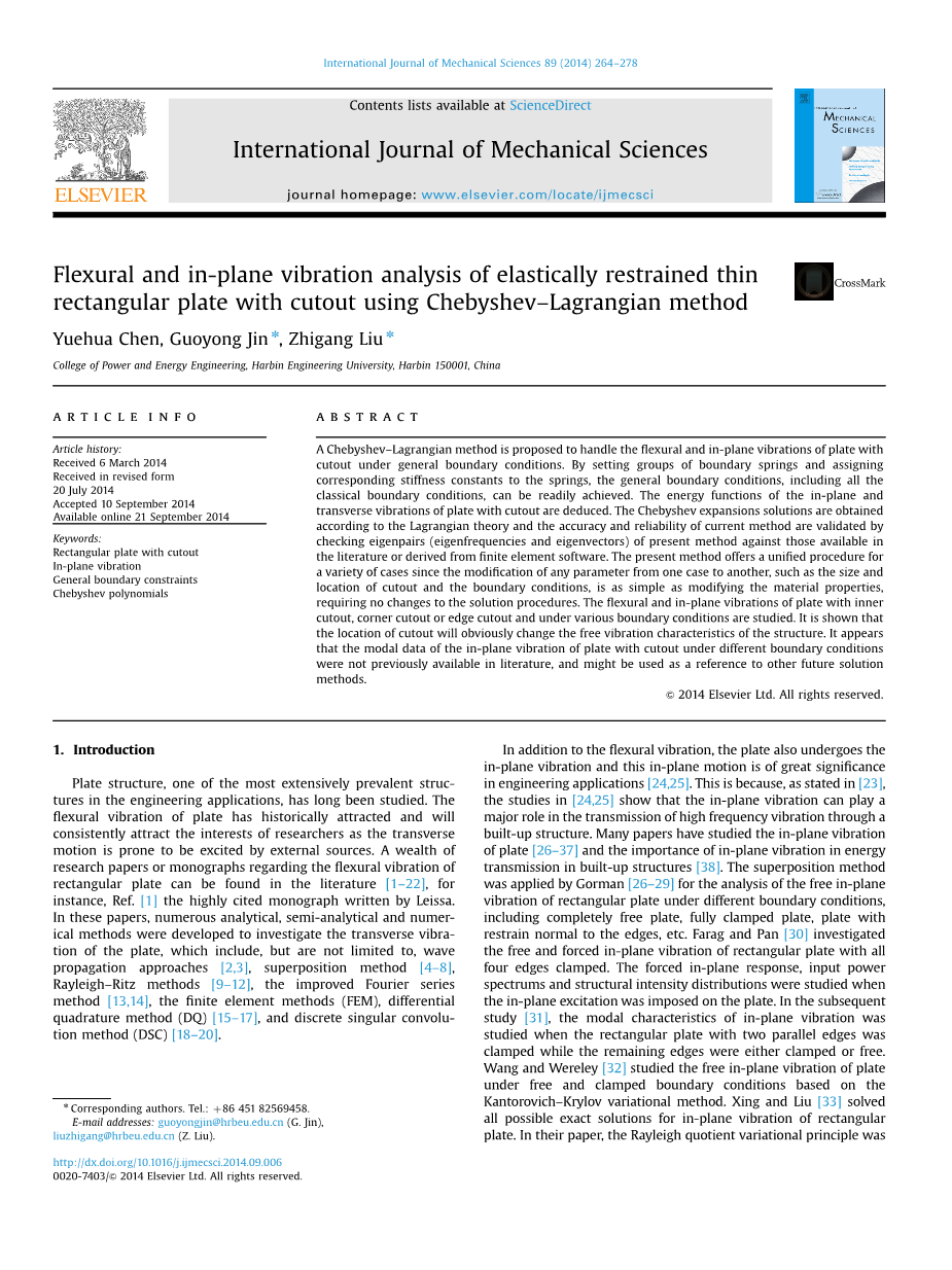 在本文中,切比雪夫-拉格朗日方法被引入到具有切口和在弹性约束边界条件下的矩形板的平面内振动的研究中。与有限元方法相比,虽然有限元方法在处理复杂结构振动等方面比现有方法具有优势,但本方法具有其自身的优点。这是因为虽然有限元现在已经成为复杂结构动力学分析的标准工具,但它在对参数与机理的深入研究上并不比分析方法更受欢迎,也不比它更方便。此外,目前的方法已经提供了一个统一的程序,以处理各种大小和位置的切口和一般边界条件下的情况。不同边界条件下的各种情况均可以被计算。似乎在不同边界条件下板的面内振动的模态结果是在文献中首次提出,并且可以用作评估其他未来解决方法的基准。