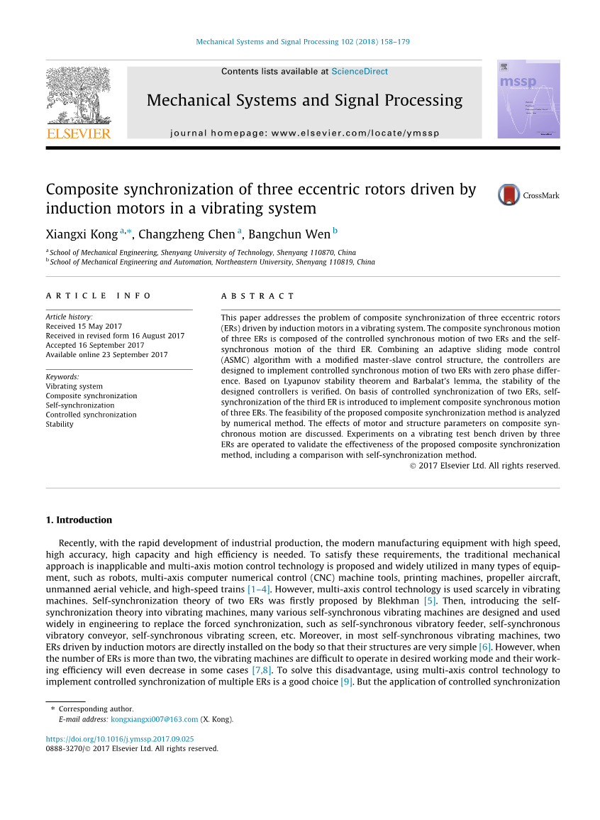 本文解决了三个偏心转子复合同步的问题(ERs)由感应电机驱动的振动系统。复合同步运动的三个ER由两个ER的受控同步运动和第三个ER的自同步运动组成。结合自适应滑动模式控制(ASMC)算法具有修改的主从控制结构,控制器是旨在实现零相位差的两个ER的受控同步运动。基于Lyapunov稳定性定理和Barbalat引理,证明了稳定性设计的控制器被验证。在两个ER控制同步的基础上,引入第三个ER的自同步,实现复合同步运动三个ERs。分析了所提出的复合同步方法的可行性通过数值方法。讨论了运动和结构参数对复合同步运动的影响。三台机组振动台实验运行ERs来验证所提出的复合同步的有效性方法,包括与自同步方法的比较。