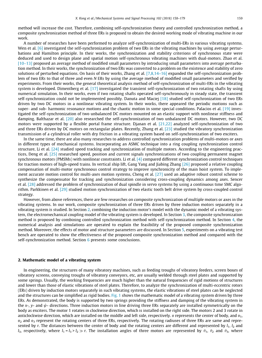 研究了多个振动系统中多个自同步系统的自同步问题,温等人利用平均摄动和汉密尔顿或哈密尔顿原理研究了振动机械中两个ERS的自同步问题。在它们的工作中,同步态的同步和稳定性判据是推导并设计了具有双电机的平面和空间运动自同步振动机械。赵等人提出了在平均摄动法中引入小参数的修正小参数平均法。在他们的工作中,两个ERS的同步转化为零的存在性和稳定性的问题。摄动方程的解。根据他们的作品,张等人扩大两人自同步的问题,三甚至N人用改良小参数平均法和经实验。从它们的工作出发,提出了振动中多自由度自同步的一般理论分析方法。系统开发。dimentberg等人。研究了两种转轴的瞬态自同步。数值模拟。在它们的工作中,即使两个转轴在稳态中自同步运行,也会产生瞬态现象。不能实现自同步。Danuta和Maciej 研究了自同步两ERS非线性振动系统中两个直流电机的驱动。在他们的作品中,出现了周期性的运动,如超、次谐共振运动与某些特殊条件下的混沌运动。帕拉西奥斯等人。研究了在非线性刚度和弹性支承上安装的两个不平衡直流电动机的自同步特性。阻尼。巴尔萨泽等人。还研究了两种不平衡直流电动机的自同步。然而,两个直流电动机由一个灵活的门式框架结构支撑。djanan等人。分析两自同步在矩形板上由DC电机驱动的三个ERS。最近,张等人。研究了振动同步。一个基于两激励器自同步振动系统的干摩擦圆柱滚子传动。