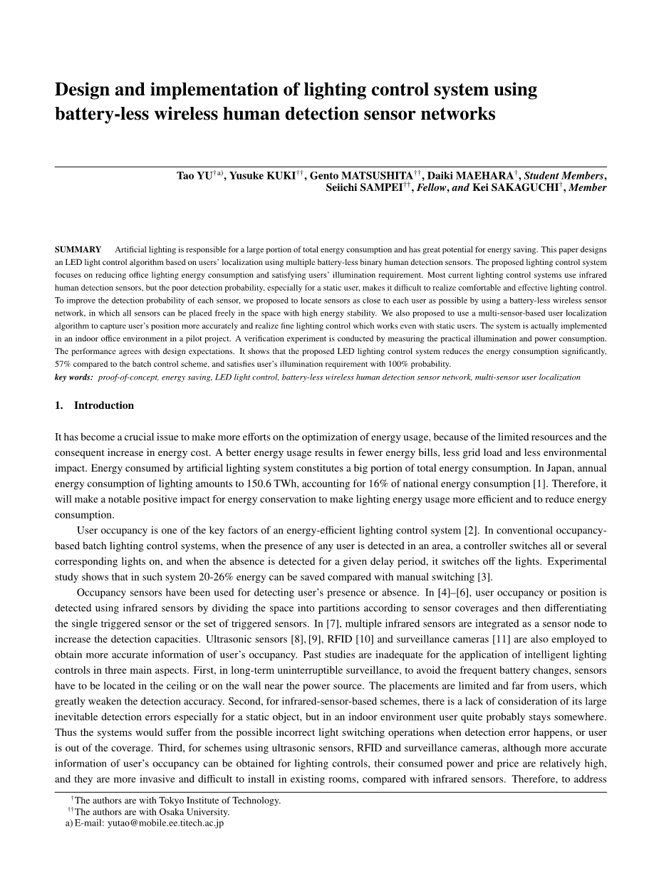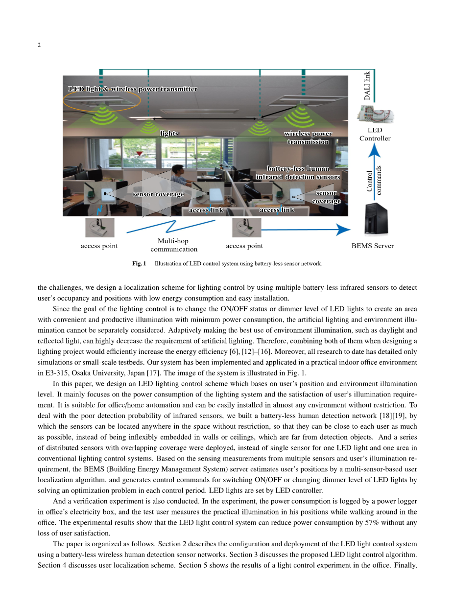 因此,当检测错误发生或用户不在覆盖范围内时,系统会遭受可能不正确的灯光切换操作。第三,对于使用超声波传感器,RFID和监控摄像机的方案,尽管照明控制可以获得更准确的用户占用信息,但其消耗功率和价格相对较高,并且它们更具侵入性且难以安装在现有房间中,与红外传感器。因此,为了应对这些挑战,我们设计了一种用于照明控制的本地化方案,通过使用多个无电池红外传感器来检测用户的占用和位置,并且能耗低,安装简单。由于照明控制的目标是改变LED灯的开/关状态或调光器水平,以便以最小的功耗创建具有方便且高效照明的区域,所以不能单独考虑人造照明和环境照明。适应性地充分利用日光和反射光等环境照明,可以大大降低人工照明的需求。所以,在设计一个时就把它们结合起来照明项目将有效提高能效[6-12]。此外,迄今为止所有的研究都只详细描述了模拟或小型试验台。我们的系统已经在日本大阪大学E3-315的实用室内办公环境中实施和应用[17]。