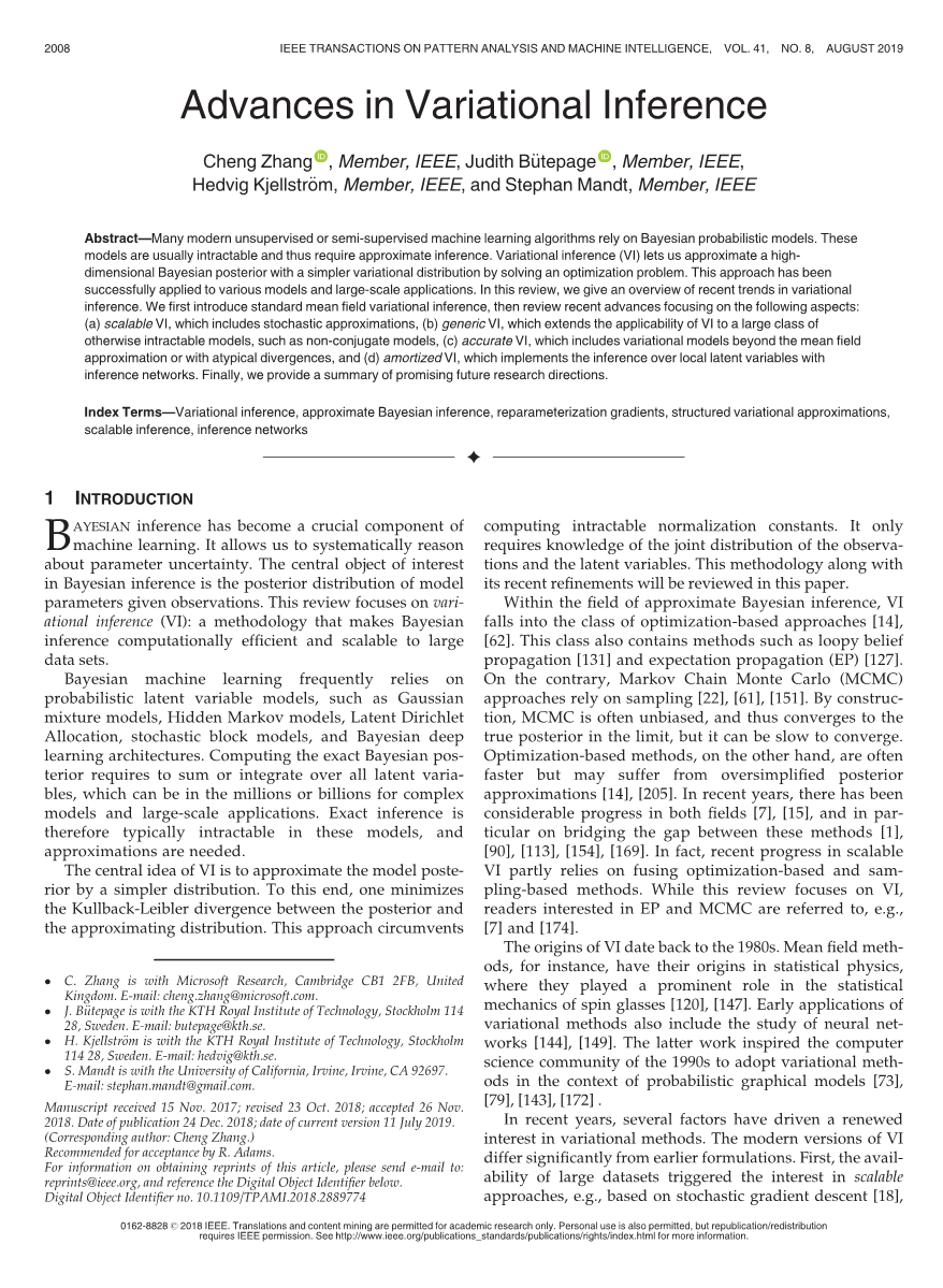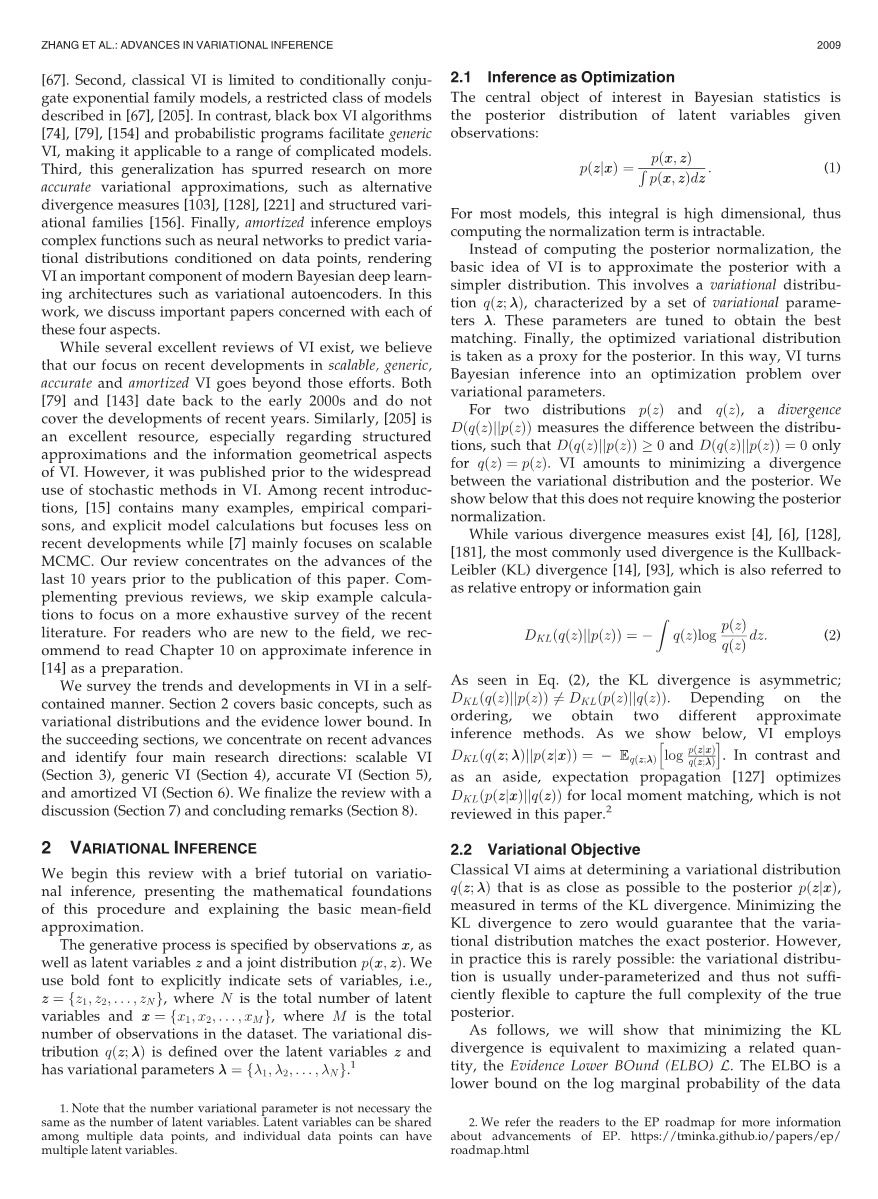 我们以独立的方式调查变分推理的趋势和发展。第2节涵盖基本概念,例如变分分布和证据下限。在接下来的部分中,我们专注于最近的进展并确定了四个主要研究方向:可扩展变分推理(第3节)、通用变分推理(第4节)、精确变分推理(第5节)和摊销变分推理(第6节)。我们通过讨论(第7节)和结束语(第8节)来完成审查。