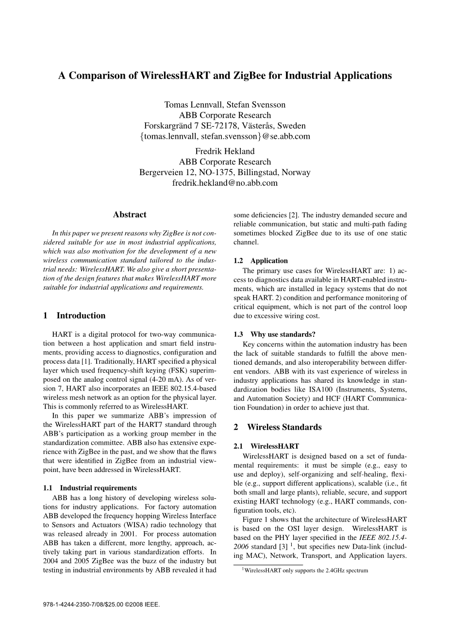 HART是一种用于双向通信的数字协议在主机应用和智能现场仪器之间,提供对诊断、配置和过程数据[ 1 ]。传统上,HART规定了物理叠加使用频移键控( FSK )的层在模拟控制信号( 4-20 mA )上。截至版本7,HART还结合了基于IEEE 802.15.4的协议无线网状网络作为物理层的选项。这通常被称为WirelessHART。在这篇论文中,我们总结了ABB对以下方面的印象HART7标准的无线HART部分通过ABB作为工作组成员参加了标准化委员会。ABB也有丰富的经验过去的ZigBee,我们证明了这些缺陷在ZigBee中从工业的角度来看,已经在WirelessHART中讨论过了。