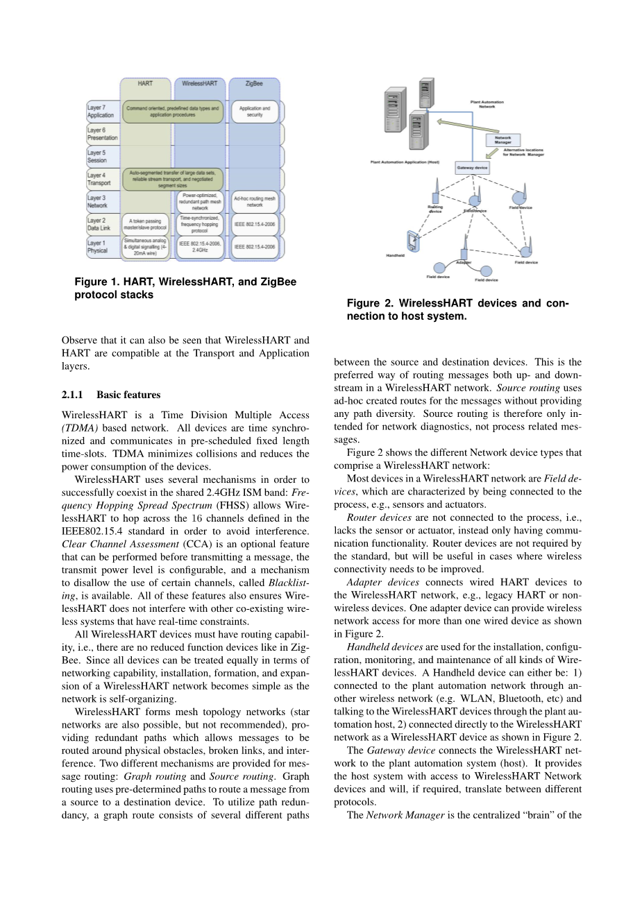 WirelessHART是基于一套基本原理设计的要求:它必须简单(例如,容易使用和部署),自组织和自修复,灵活(例如,支持不同的应用)、可伸缩的(即,适合小型和大型工厂),可靠、安全和支持现有HART技术(例如HART命令、配置成形工具等)。图1显示了WirelessHART的体系结构基于OSI层设计。WirelessHART是基于IEEE 802.15.4中指定的PHY层-2006标准[ 3 ] 1,但指定新的数据链接(包括MAC )、网络层、传输层和应用层。