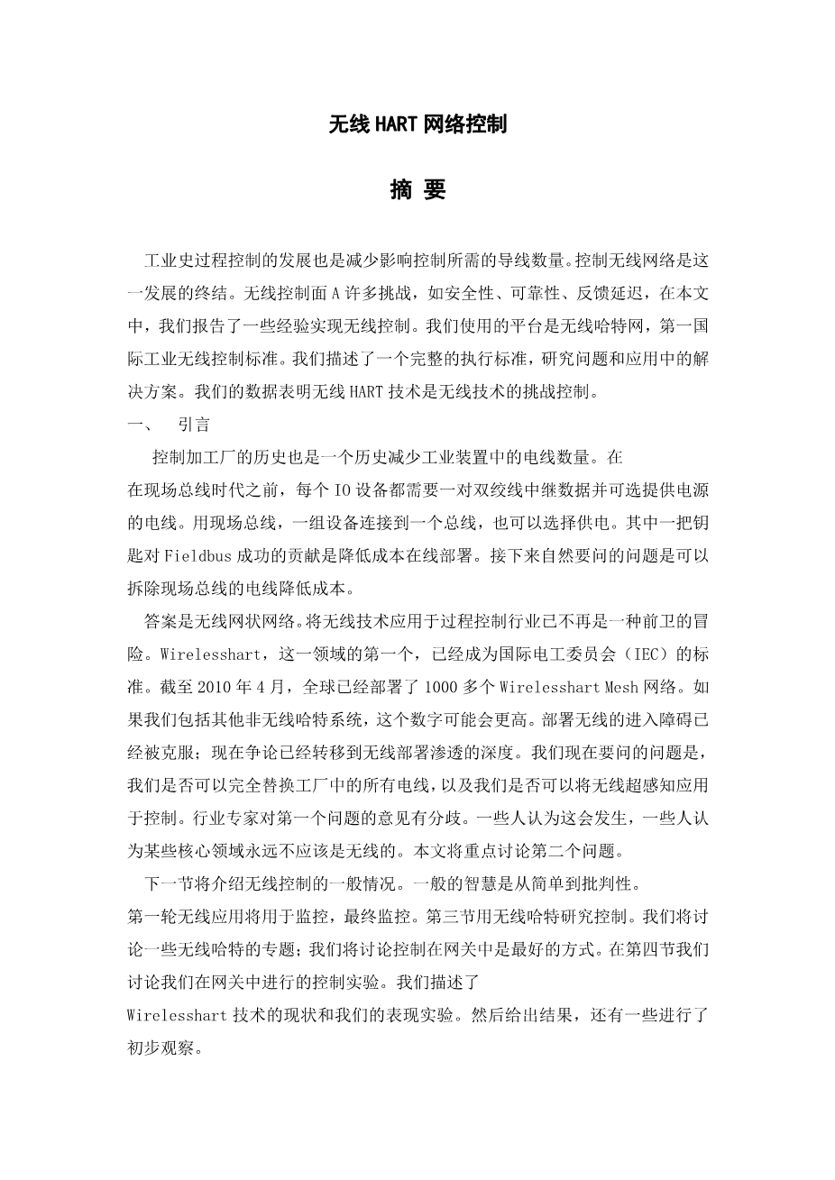 The next section looks at control with wireless in general. The common wisdom is to go from the simple to the critical. The first round of wireless applications will be for monitoring, and eventually supervisory control. Section III studies control with WirelessHART. We shall discuss some topics specific to WirelessHART; we shall argue that control in the gateway is the best way to go. In Section IV we discuss our experiment with control in the gateway. We describe thestate of the WirelessHART technology and how we perform the experiments. The results are then presented and some preliminary observations are made. Section V concludes the paper.