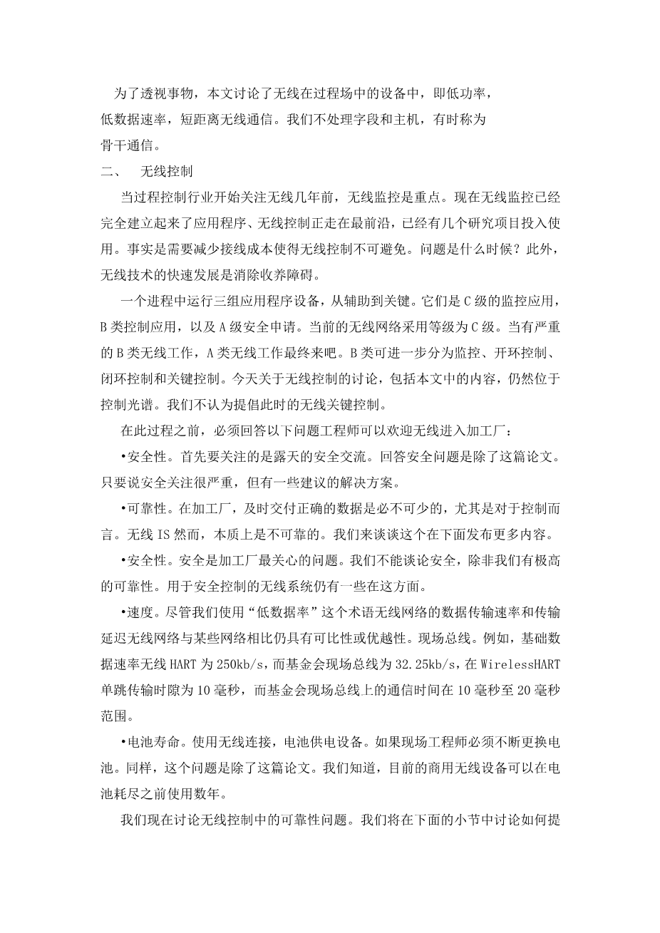 To put things in perspective, this paper talks about wireless among the devices within a process field, i.e., the low power, low data rate, and short distance wireless communications. We do not address the wireless communication between the field and the host, which is sometimes referred to as backbone communication.