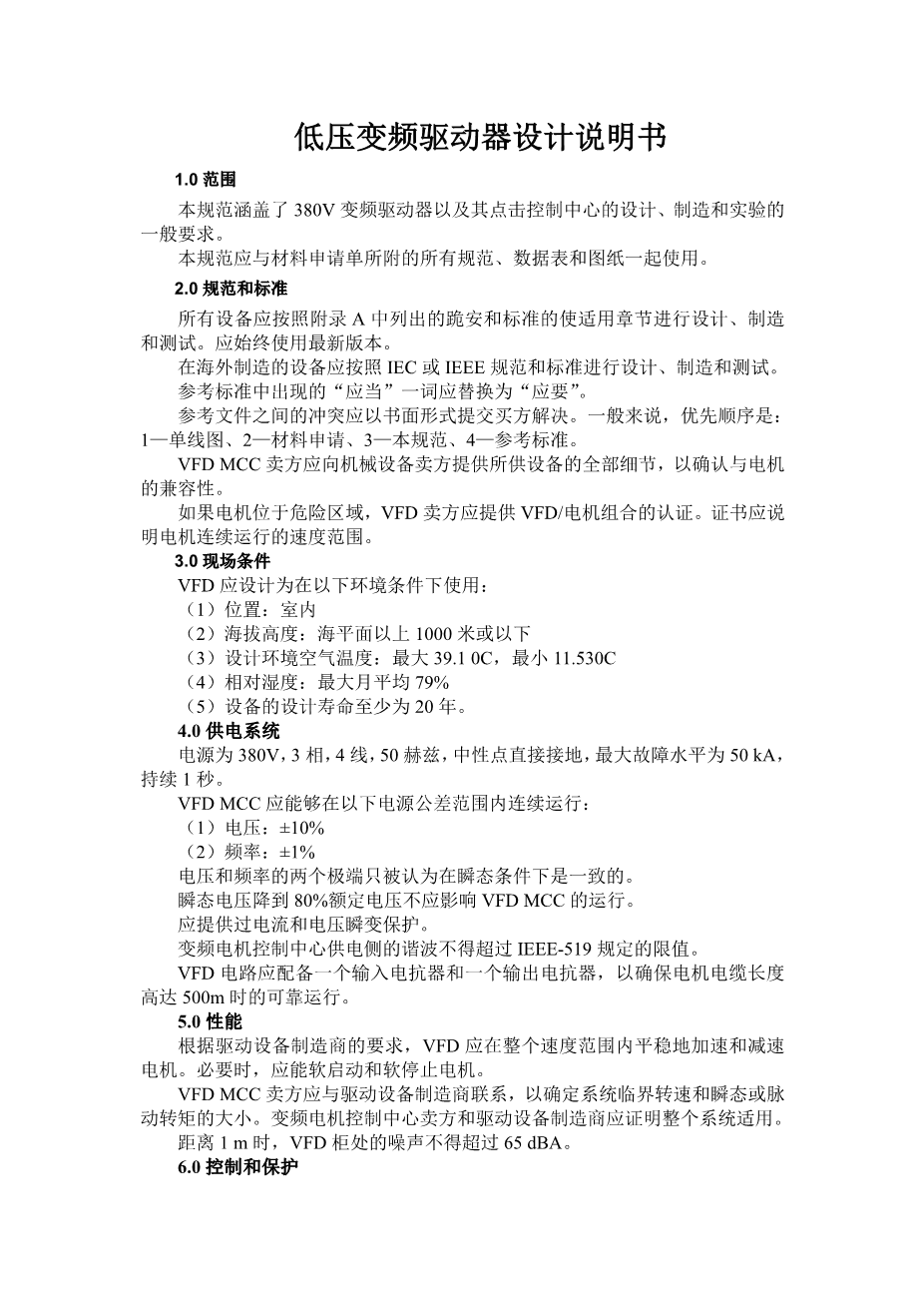 This specification covers the general requirements for design; manufacturing and testing of 380V variable frequency drive and its MCC for .