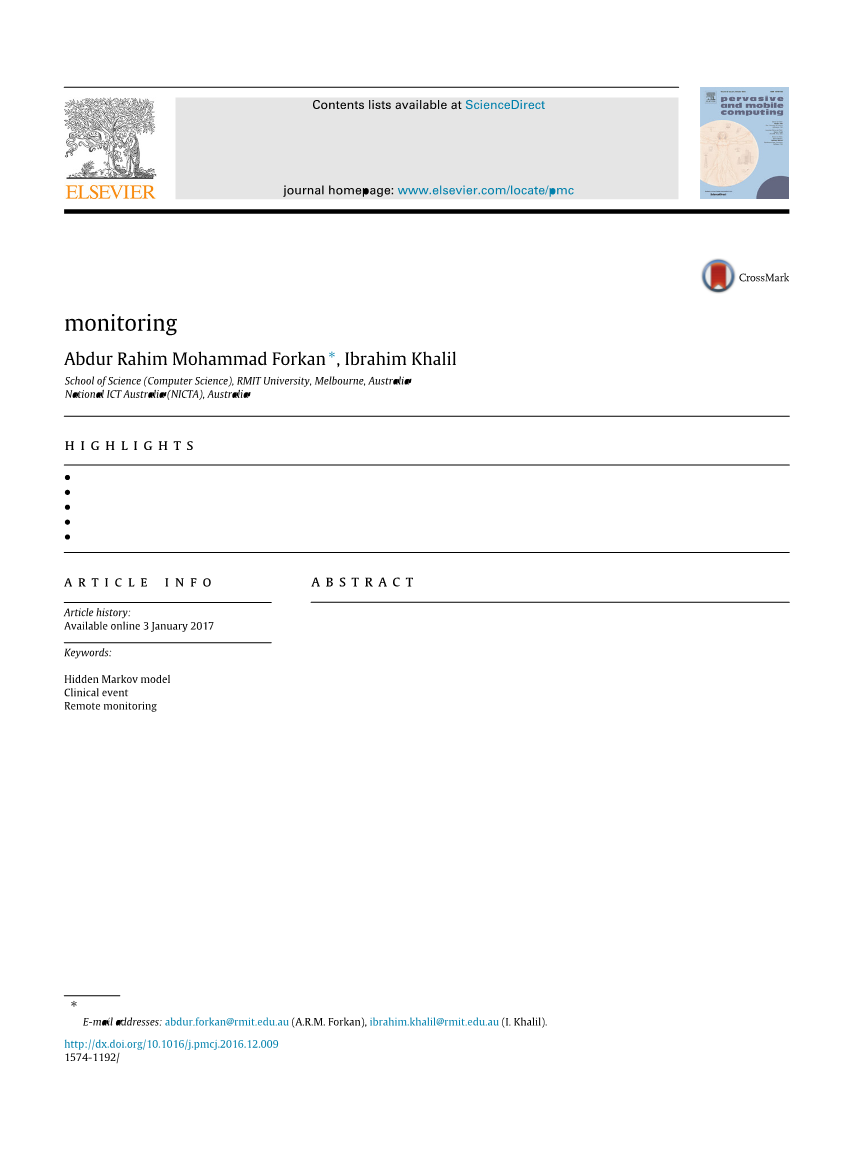 这个研究的目的是开发一种,对使用在临床事件发生之前观察生命体征值的患者预测未来临床发作的概率模型。生命体征值(例如心率、血压)用于检测患者的健康的生理功能,那些同时发生的变化表明患者健康状况的转变。慢性患者们独居在家,因为缺少一个有效的拥有提前预测能力的自动系统而死于各种各样的疾病。我们开发的系统,可以提供对一个未知病人未来临床事件的概率预测,利用了从许多相似病人处学习到的多种生命体征的相互关联性。在这篇文章中,主成分分析技术(PCA)是将拥有已知医疗条件的患者分成了多个类别。隐马尔科夫模型采用了概率分类和对未来临床状态的预测。通过比较来自基于学习模型的拥有神经网络的隐马尔可夫模型的结论,相较于静态预测模型来解决问题,动态概率模型更有优势。六种生命体征数据是由麻省理工学院生理银行存档的MIMIC-Ⅱ数据库1023位患者的数据,两种学习模型都是通过六种生命体征数据,来进行学习和评估。最好的HMM模型选择使用了最大似然概率模型,并更多地用于个性化的远程监控,来预报一个被持续监测的患者,最有可能发生的临床状态。拥有扩充能力的云端计算机是用于快速学习来自大数据的多种多样的临床事件。我们的结论表明,发达技术使用多种生理参数趋势,可以显著增强传统的基于家庭临床异常检测和预测监测系统。