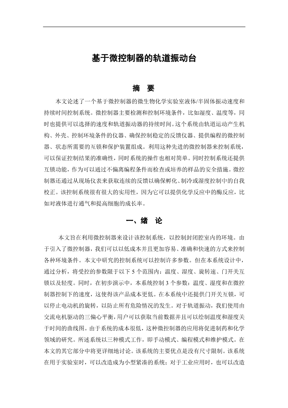 A novel procedure of controlling various environmental conditions, shaking speed and duration for shaking of liquid/ semi solid required for microbiology/ chemical research laboratories with the use microcontroller is presented in this paper. The Microcontroller monitors and controls the environmental conditions i.e. humidity, temperature and also provides selectable speed, duration of orbital motion shaker. The system consists of orbital motion producing mechanism, the enclosure for controlled conditions, instruments to control environmental conditions, feedback instruments in order to establish control and microcontroller system which provides programming, interlock and protection for conditions required. This advance microprocessor control ensures reproducible results and operator convenience. System interlocks are also provided in order as a safety measures towards samples examined or cultured by not allowing deviation from the programmed conditions. Microcontroller also ensures self correction in incubation, refrigeration or humidity controls by taking continuous feedback from field instruments. The control system becomes significant as it provides reproducibility in enzyme reactions like aeration in liquid or faster cell growth rate.