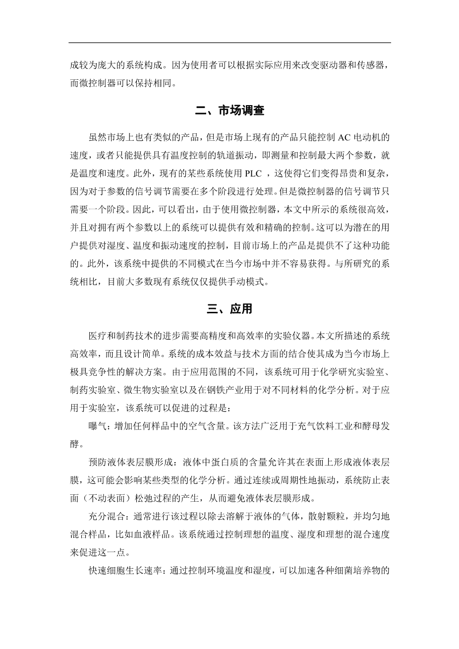 There are similar products in the market. But the existing products in market either allow only shaking of the chemicals in the flask by controlling speed of AC motor used for shaking [3] or provide orbital shaking with temperature control only [4], i.e. maximum two parameters are measured and controlled i.e. temperature and speed. Also the existing systems use PLCs [5] which makes them expensive and complicated as for processing of parameters signal conditioning at multiple stages is required. But with microcontroller signal conditioning at only one stage is required. Thus it can be seen that the system showed in this paper is cost effective due to the use of microcontroller and provides effective and accurate control for more than two parameters. This provides the potential users to perform chemical processes which involve control over humidity, temperature and speed of shaking at same time which is not provided by existing products in market. Also the different modes provided in our system are not readily available in today’s market. Most of the affordable existing systems provide only manual mode in contrast to the discussed system.
