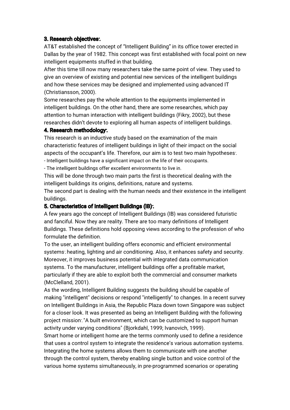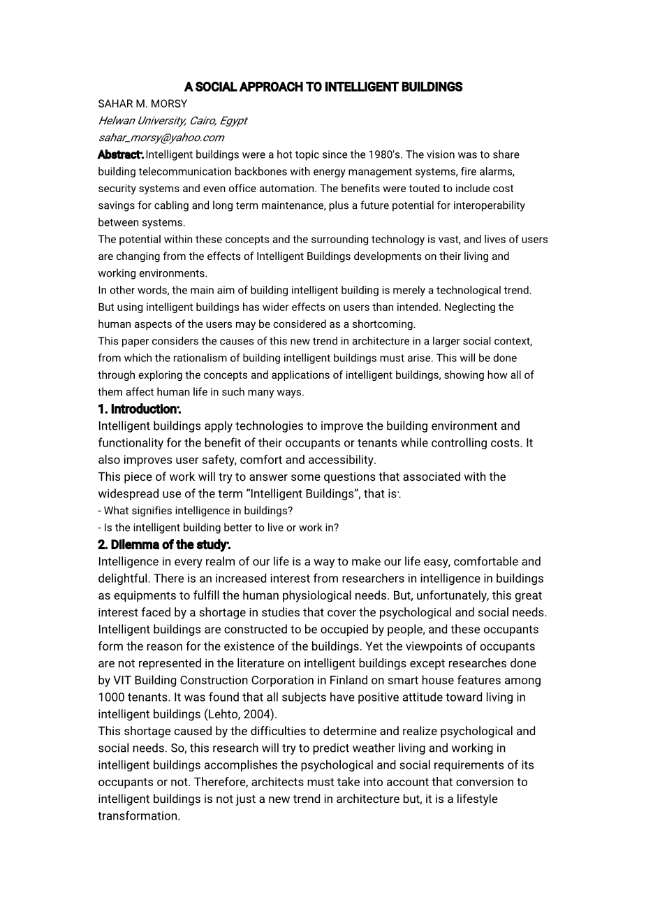 This research is an inductive study based on the examination of the main characteristic features of intelligent buildings in light of their impact on the social aspects of the occupantrsquo;s life. Therefore, our aim is to test two main hypotheses: