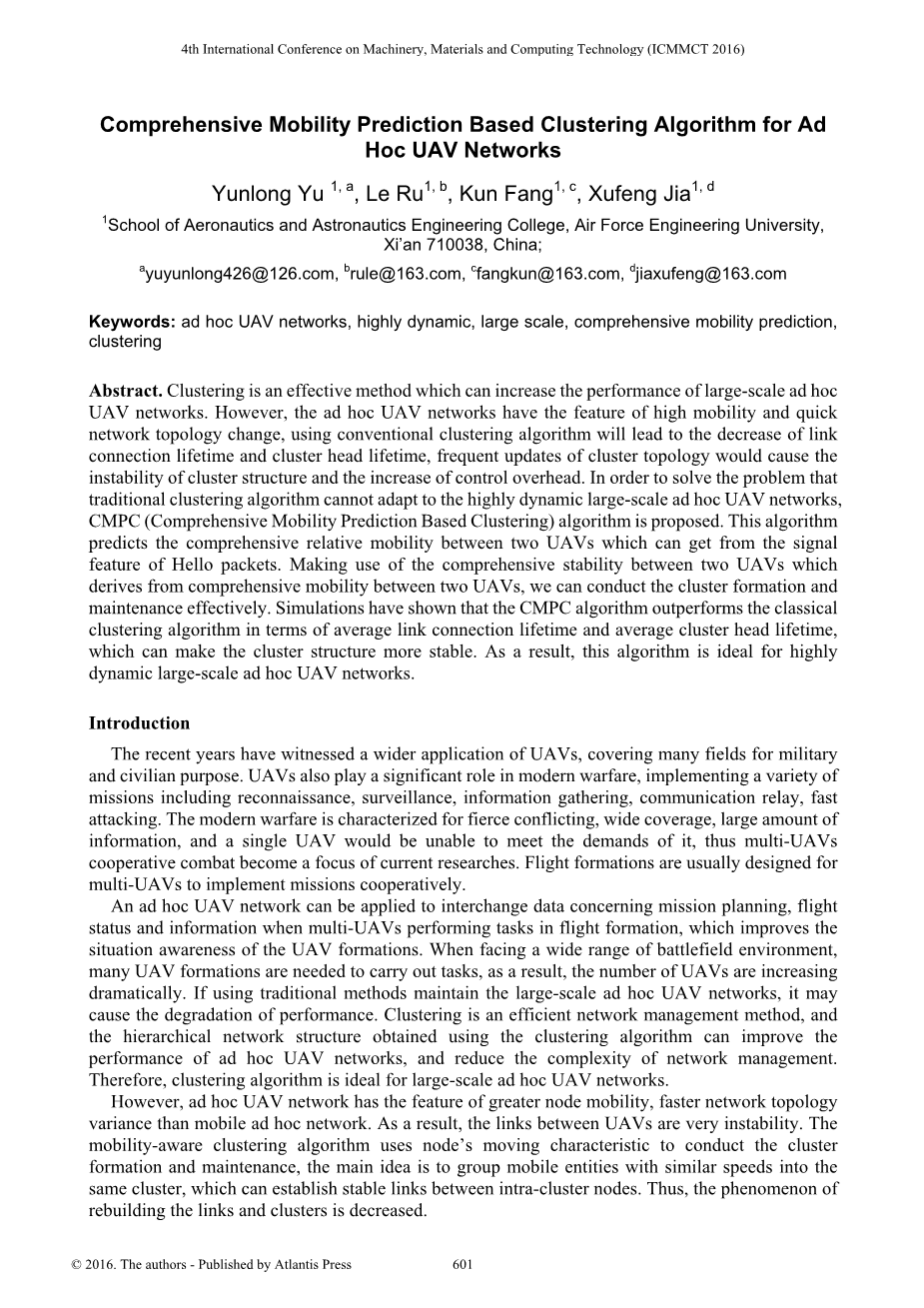 我们提出了一种可以全面预测无人机机动性的模型。(综合移动预测聚类)CMPC模型的输出值可以提供准确的聚类和维护。