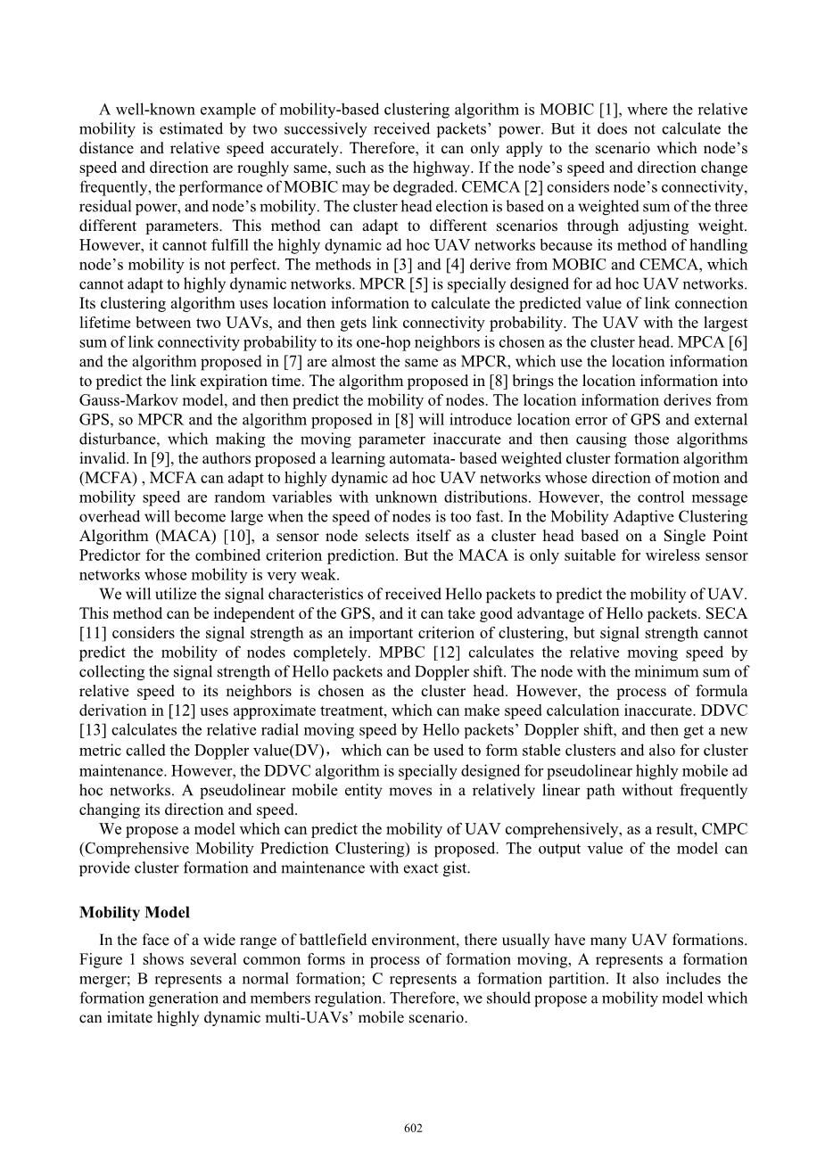 一个著名的基于移动的集群算法的例子是MOBIC ,它的相对位置移动性是由两个连续接收包的功率估计的。但是它并没有计算出准确的距离和相对速度。因此,它只能应用于速度和方向大致相同的场景,比如高速公路。如果节点的速度和方向频繁发生变化通常情况下,MOBIC的性能可能会降低。CEMCA 考虑了节点的连接性,剩余功率和节点的移动性。集群领导的选举是基于这三者的加权总和。该方法可以通过调整不同参数的权重来适应不同的情况。然而,,它无法实现高度动态的临时无人机网络。