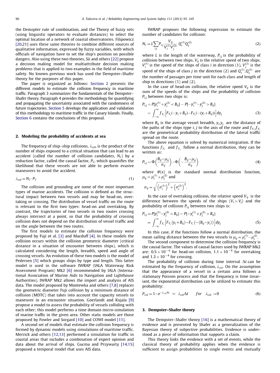 本文的结构如下:第2节提出了估计海上交通碰撞频率的不同模型。第3节总结了Dempster-Shafer理论的基础。第4节提供了量化和宣传与未来轨迹随机性有关的不确定性的方法。第5节开发了这种方法在加那利群岛海上交通中的应用和验证。最后,第6节包含了这个建议的结论。