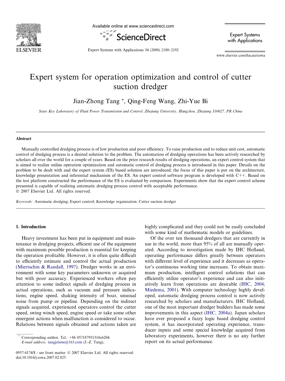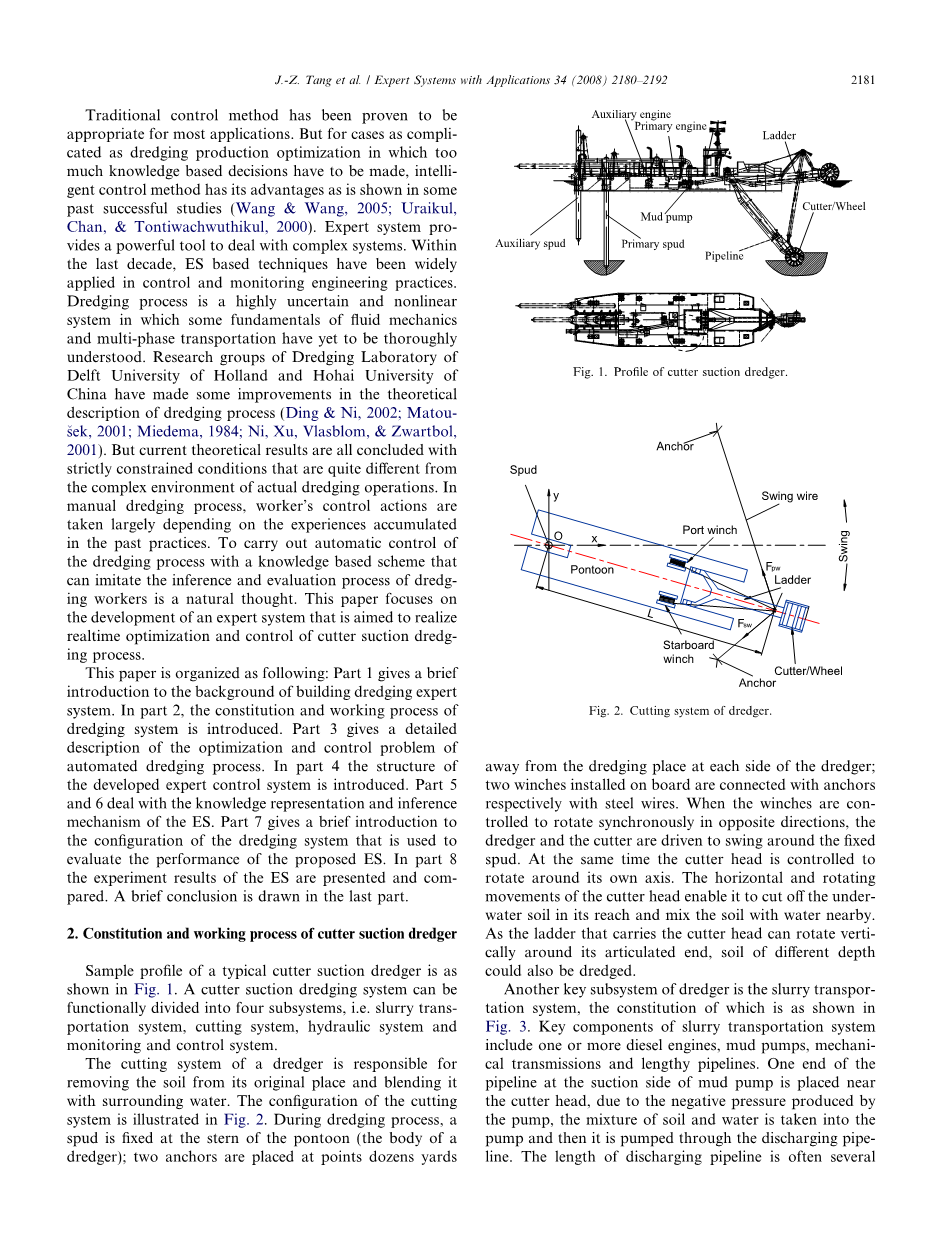 传统的控制方法已被证明适用于大多数应用。但对于复杂的疏浚生产优化案例来说,需要进行过多的知识决策的情况下,智能控制方法具有以往成功研究所显示的优势(Wang&Wang,2005; Uraikul,Chan, &Tontiwachwuthikul,2000)。专家系统为处理复杂系统提供了强大的工具。在过去的十年中,基于ES的技术已经广泛应用于控制和监测工程实践中。疏浚过程是一个高度不确定的非线性系统,其中流体力学和多相交通的一些基础尚未完全理解。荷兰代尔夫特大学和河海大学疏浚实验室的研究小组对疏浚过程的理论描述做了一些改进(Ding&Ni,2002; Matou-sek,2001; Miedema,1984; Ni,Xu,Vlasblom, Zwartbol,2001)。但目前的理论结果都是在严格限制的条件下得出的,这些条件与实际疏浚作业的复杂环境相差甚远。在人工疏浚过程中,工人的控制行为很大程度上取决于过去实践中积累的经验。采用能够模拟疏浚工人的推断和评估过程的基于知识的方案对疏浚过程进行自动控制是一种自然的想法。本文着重于开发专门的系统,目的是实现刀具吸取过程的实时优化和控制。