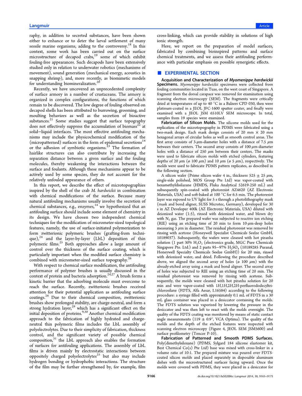在这份报告中,我们描述了由蟹壳M.hardwickii结合表面化学修饰所激发的显微照片的效果。 由于许多天然防污机理通常涉及化学物质(例如酶)的分泌,14 我们假设防污表面应该在其设计中包含一些化学元素。 我们已经选择了两种独立的化学技术来改变微米尺寸的拓扑特征,即使用表面引发的聚合形成两性离子聚合物刷子(嫁接技术),24 和薄层聚合物薄膜的逐层(LbL)沉积。25 两种方法均可对表面涂层厚度进行大量控制,当改性表面化学与微米尺寸的表面形貌相结合时,这一点特别重要。26