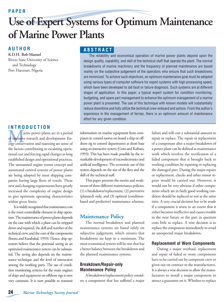 船用电厂的可靠性和经济运行取决于运营工厂技术人员的设计质量,能力和技能。 船舶机械的正常故障和计划维护的频率主要基于确保这种故障被最小化的操作员的主观判断。 为了实现这些目标,必须采用各种类型的计算机软件来实现最佳维护目标,这些计算机软件具有高速处理速度的专家系统,这些系统已经被开发用于帮助故障或故障诊断。 这样的系统处于不同的应用阶段。 本文提出了一个典型的状态监测,预算和备件管理专家系统,以提高船舶电站的最优管理水平。 这种技术与已知型号的使用将大大减少停机时间,并充分利用船上和岸上的技术人员。 从作者在渡轮管理方面的经验来看,对于任何特定的情况都有最佳的维护工作量。
