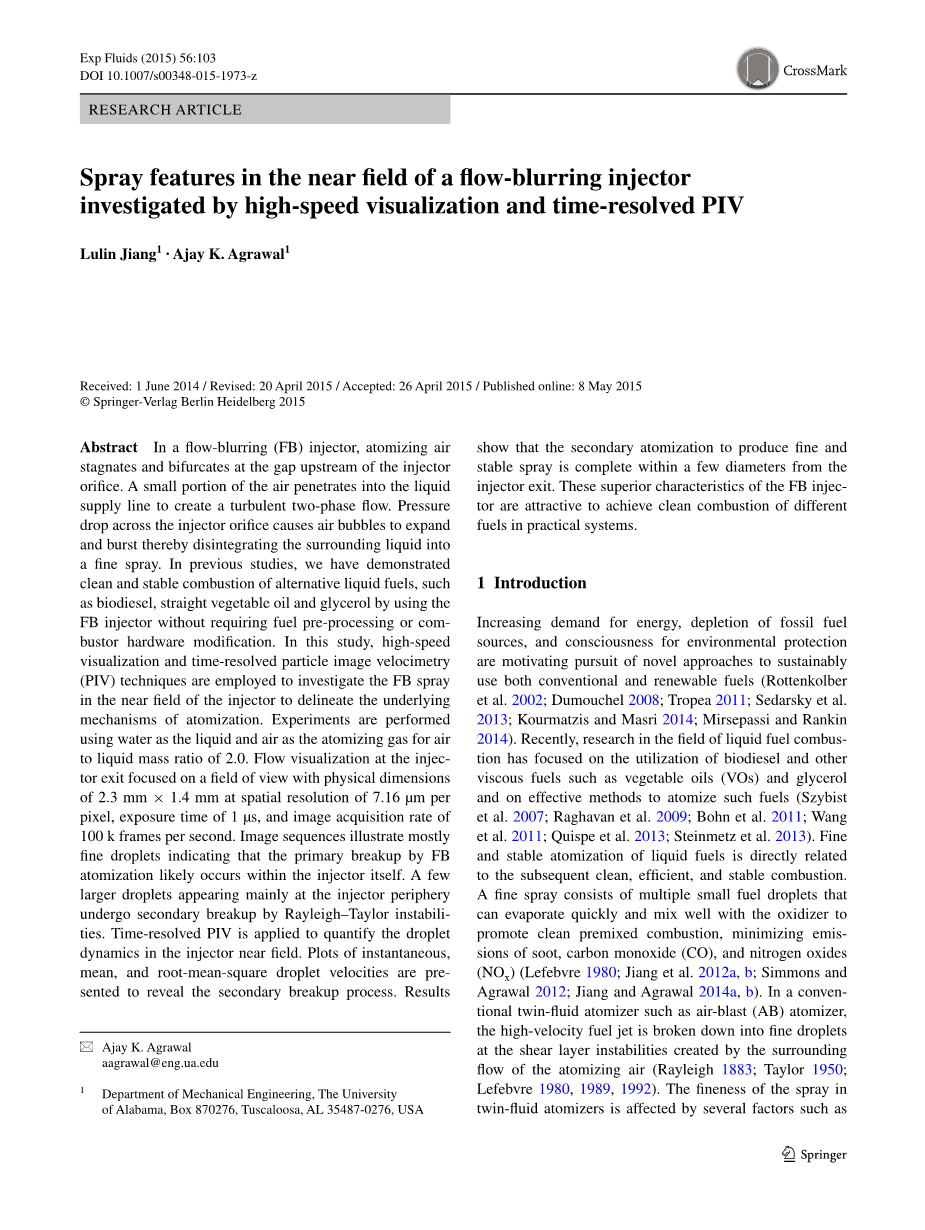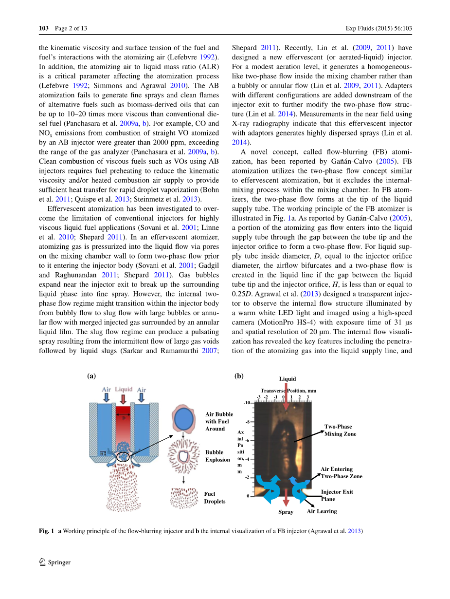 日益增长的能源需求,化石燃料资源的枯竭以及环境保护意识促使人们寻求可持续使用传统燃料和可再生燃料的新方法(Rottenkolber等2002; Dumouchel 2008; Tropea 2011; Sedarsky等2013; Kourmatzis和Masri 2014; Mirsepassi和Rankin 2014)。最近,液体燃料燃烧领域的研究集中在生物柴油和其他粘性燃料如植物油(VO)和甘油的利用以及有效的雾化这些燃料的方法上(Szybist et al.2007; Raghavan et al.2009 ; Bohn等2011; Wang等2011; Quispe等2013; Steinmetz等2013)。液体燃料细微而稳定的雾化与随后的清洁,高效和稳定的燃烧直接相关。精细喷雾由多个小燃料液滴组成,可快速蒸发并与氧化剂充分混合,促进清洁的预混合燃烧,最大限度减少碳烟,一氧化碳(CO)和氮氧化物(NOx)的排放(Lefebvre 1980; Jiang et al。 2012a,b; Simmons和Agrawal,2012; Jiang和Agrawal,2014a,b)。在传统的双流体雾化器如空气喷射(AB)雾化器中,高速燃料射流在雾化空气的周围流动产生的剪切层不稳定性下分解成细小液滴(Rayleigh 1883; Taylor 1950; Lefebvre 1980,1989,1992)双流体雾化器喷雾的细度受多种因素影响,如燃料的运动粘度和表面张力以及燃料与雾化空气的相互作用(Lefebvre 1992)。此外,雾化空气 - 液体质量比(ALR)是影响雾化过程的关键参数(Lefebvre 1992; Simmons and Agrawal 2010)。 AB雾化不能产生优良的喷雾和替代燃料的清洁火焰,如生物质衍生的油,其粘度可能比传统柴油燃料高10-20倍(Panchasara et al。2009a,b)。 例如,由AB喷油器雾化的直接VO燃烧产生的CO和NOx排放量大于2000 ppm,超过了气体分析仪的范围(Panchasara et al。2009a,b)。 使用AB喷射器清洁燃烧诸如VO的粘性燃料需要燃料预热以降低运动粘度和/或加热的燃烧空气供应以提供足够的热传递以快速液滴汽化(Bohn等人2011; Quispe等人2013; Steinmetz等人 al。2013)。已经研究了泡腾雾化以克服常规喷射器对于高粘度液体燃料应用的限制(Sovani等人2001; Linne等人2010; Shepard 2011)。在泡腾雾化器中,雾化气体通过混合室壁上的孔隙被加压到液体流中,以在进入喷射器主体之前形成两相流(Sovani et al.2001; Gadgil and Raghunandan 2011; Shepard 2011)。气泡在注射器出口附近膨胀,将周围的液相分解为细小的喷雾。然而,内部两相流动状态可能会在喷射器体内从气泡流过渡到具有大气泡的团状流或具有由环形液膜围绕的合并注入气体的环状流。段塞流状态可以产生由大的气体间隙随后液塞(Sarkar和Ramamurthi 2007; Shepard 2011)的间歇性流动产生的脉动喷雾。最近,林等人。 (2009,2011)设计了一种新型泡腾(或充气液体)喷射器。对于适度的曝气水平,它在混合室内产生均匀的两相流,而不是气泡或环形流(Lin et al.2009,2011)。在喷射器出口的下游添加具有不同配置的适配器以进一步修改两相流结构(Lin等2014)。使用X射线照相术在近场进行的测量表明,具有适配器的这种泡腾注射器产生高度分散的喷雾剂(Lin et al。2014)。