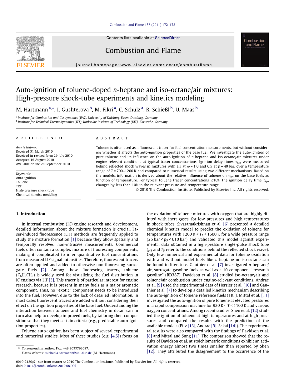 甲苯自点火是近年来研究的热点之一。这些研究中的大部分(例如,[4,5])关注的是甲苯混合物的氧化,这些氧被惰性气体稀释,以低压和高温度的激波管。Sivaramakrishnan等。[6]提出了详细化学动力学模型来预测甲苯的氧化与1200 K lt; T5 lt; 1500 K温度压力范围宽(25条lt; p5 lt; 610酒吧)和验证该模型对实验数据获得的高压单脉冲激波管(p5和T5指背后的条件反射激波)。在文献中,只有少量的甲苯氧化和没有像正庚烷或异辛烷的甲苯氧化的数值和实验数据可以在文献中找到。Gauthier等[7]研究了正庚烷/空气、替代汽油燃料以及10个成分的“研究汽油”(RD387)。Davidson等[8]研究了在发动机相关条件下的异辛烷/空气和甲苯/空气燃烧。Andrae等[9]利用Herzler等[10]和Gauthier等[7]的实验数据,建立了描述甲苯参考燃料自燃的详细动力学机制(TRF)。米塔尔等[11]研究了一种快速压缩机器中纯甲苯在高压下的自动点火,其压力为920 K lt; T lt; 1100 K和各种氧气浓度。在最近的研究中,Shen等[12]研究了甲苯在高温高压下的点火,并将其与现有模型的预测结果进行比较(Pitz [13], Andrae[9],酒井[14])。实验结果与戴维森等[8]、米塔尔和宋[11]的研究结果进行了比较。比较表明,在化学计量条件下,戴维森等人的活化能比沈氏报告的小2倍[12]。他们将这一分歧归因于戴维森实验中发生的提前点火的问题[8],起因是他们的激波管受到污染。的一项新研究Vasu等。[15]的发现驳斥了沈等。[12]通过调查墙钝化的影响(即清除之前的激波管各自的气体混合物疏散和填充测试气体),污染物的影响,和杂质造成不适当的激波管清洗策略在化学计量的测量点火延迟时间甲苯/空气混合物压力附近50 966 - 1211 K的酒吧和温度。他们将在不同温度范围内的压力剖面上所见的预点火特性归因于点火系统的性质,并发现预点火不会影响点火延迟时间的准确性。点火延迟时间的确定活化能与戴维森等[8]的早期数据有较好的一致性[0],并显示米塔尔等[11]RCM数据的差异[1]。