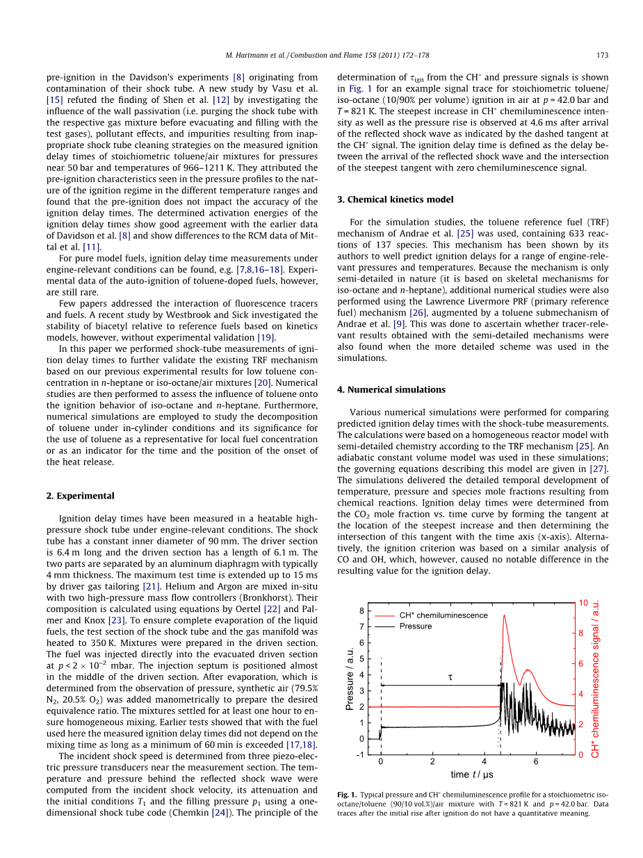 在与发动机有关的条件下,在高压高压激波管中测量了点火延迟时间。激波管的内径恒定为90毫米。驱动部分为6.4 m长,驱动段长度为6.1米。这两部分由一个典型的4毫米厚的铝隔膜分开。最大测试时间延长到15 ms by driver gas剪裁[21]。氦和氩是混合在原位的两个高压质量流量控制器(Bronkhorst)。它们的组成是由Oertel[22]、Palmer和Knox[23]计算的。为了保证液体燃料的完全蒸发,激波管和气体歧管的测试段加热到350克。在驱动部分准备了混合物。在p lt; 2 10-2 mbar中,燃料被直接注入到真空中。注射隔膜几乎位于驱动部分的中间位置。通过对压力的观测确定了蒸发后的合成空气(79.5% N2, 20.5% O2),以制备理想的等效比。混合物至少固定了一个小时,以保证均匀混合。早期的试验表明,在这里使用的燃料,测量的点火延迟时间不依赖于混合时间,只要至少超过60分钟[17,18]。该事件冲击速度由测量部分附近的三个压电式压力传感器确定。从入射激波速度、衰减和初始条件T1和使用一种在线激波管码(Chemkin[24])计算出反射激波后的温度和压力。从CH和压力信号中确定信号的原理如图1所示,在p = 42.0 bar和T = 821 K的空气中,stoichitoluene / iso-octane (10/90% / volume)点火的一个例子信号跟踪。CH化学发光强度的最大增加和压力上升是在反射冲击波到达后的4.6毫秒观察到的。将点火延迟时间定义为反射激波到达和最陡切线与零化学发光信号的交点之间的延迟。3所示。