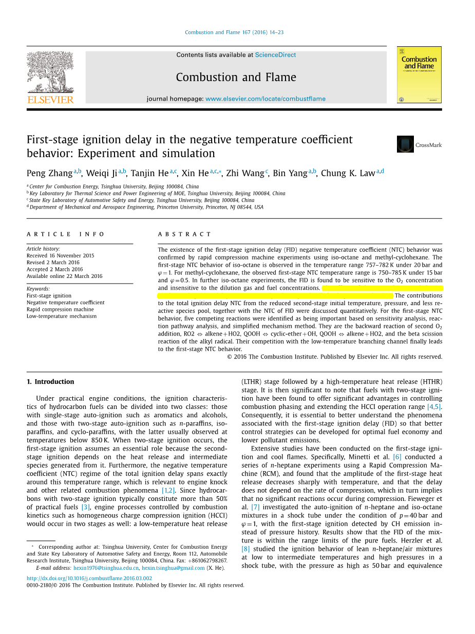 First-stage ignition delay in the negative temperature coefficient behavior: Experiment and simulation Abstract The existence of the first-stage ignition delay (FID) negative temperature coefficient (NTC) behavior was confirmed by rapid compression machine experiments using isooctane and methyl-cyclohexane. The first-stage NTC behavior of isooctane is observed in the temperature range 757–782 K under 20 bar and ϕ =1.For methyl cyclohexane, the observed first-stage NTC temperature range is 750–785 K under 15 bar and ϕ =0.5. In further isooctane experiments, the FID is found to be sensitive to the O2 concentration and insensitive to the dilution gas and fuel concentrations. The effects of the FID and its NTC behavior on the total ignition delay NTC were analyzed using a detailed n-heptane mechanism. The contributions to the total ignition delay NTC from the reduced second-stage initial temperature, pressure, and less reactive species pool, together with the NTC of FID were discussed quantitatively. For the first-stage NTC behavior, five competing reactions were identified as being important based on sensitivity analysis, reaction pathway analysis, and simplified mechanism method. They are the backward reaction of second O2 addition, RO2 hArr; alkene HO2, QOOH hArr; cyclic ether OH, QOOH hArr; alkene HO2, and the beta scission reaction of the alkyl radical. Their competition with the low-temperature branching channel finally leads to the first-stage NTC behavior.