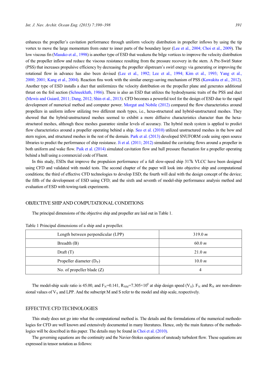 通过使用尖端涡流将大动量从边界层的外部移动到内部部分,通过螺旋桨流入中的均匀速度分布来增强螺旋桨的气蚀性能(Lee等人,2004;Choi等,2009)。 低粘度翅片(Masuko等,1998)是另一种类型的ESD,它会削弱舱底涡,从而改善螺旋桨流入的速度分布,并降低由船尾压力恢复引起的粘滞阻力。 预旋流定子(PSS)还通过预先产生或改善旋转流动来降低螺旋桨滑流的旋流能量来提高推进效率(PSS)Lee等,1992; Lee等人,1994; Kim等人,1993; Yang等人, 2000; 2001; Kang等人,2004)。 反应翅片与PSS类似的节能机制一起工作(Kawakita等,2012)。 另一种类型的ESD安装了一个管道,该管道使螺旋桨平面上的速度分布均匀,并在箔片部分产生额外的推力Schneekluth,1986)。 还有一个ESD,它利用了PSS和管道的流体力学特性(Mewis和Guiard,2011;Dang,2012;Shin等,2013)。 由于数值方法和计算机能量的快速发展,CFD成为ESD设计的有力工具。Morgut和Nobile(2012)比较了采用两种不同网格类型(即六结构网格和混合非结构网格)均匀流入螺旋桨周围的流动特性。 他们表明,混合非结构化网格似乎表现出比六结构网格更具扩散特性的特征,尽管这些网格保证了相似的精度水平。 混合网格系统应用于预测在船后操作的螺旋桨周围的流动特性。Seo等人。 (2010年)在船首和船尾区域使用非结构化网格,并在结构域的其余部分使用结构化网格。Park等人 (2013)使用开源库开发了SNUFORM代码来预测船舶阻力的性能。Ji等人 (2011年;2012) 模拟均匀和尾流中螺旋桨周围的空化流动。Paik等人 (2014)使用Fluent的商业代码模拟在船体后面运行的螺旋桨的空化流动和船体压力波动。