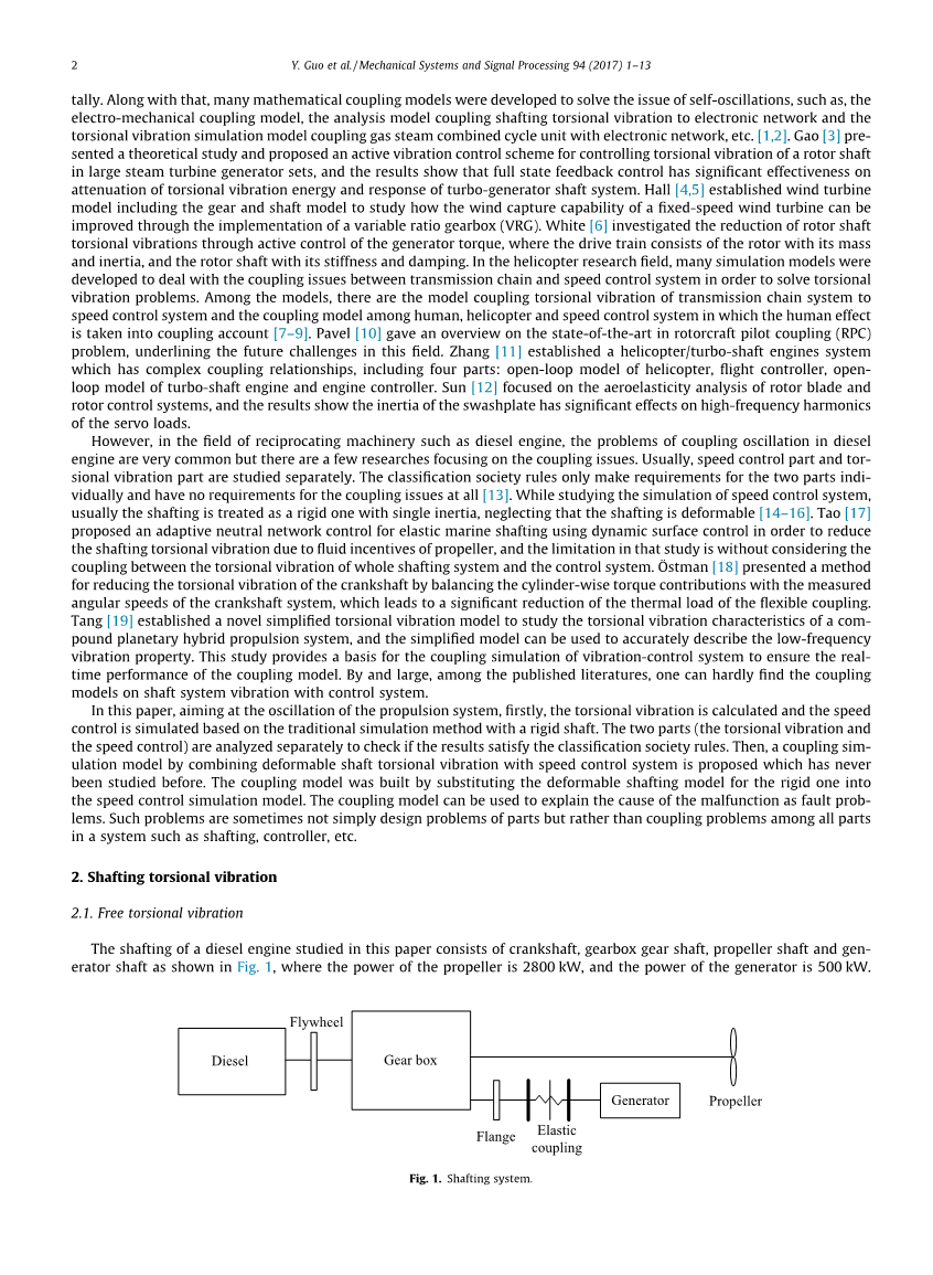 然而,在柴油机等往复机械领域,柴油机的耦合振荡问题非常普遍,但目前关于耦合问题的研究较少。 通常,速度控制部分和扭转振动部分分别研究。 船级社规则只对两部分单独作出要求,对联轴器问题根本没有要求[13]。 在研究速度控制系统的仿真时,通常将轴系视为具有单一惯性的刚性轴,忽略轴系可变形[14–16]。 陶[17] 提出了一种基于动态表面控制的弹性海洋轴系的自适应中立网络控制方法,以减少螺旋桨流体激励引起的轴系扭转振动,该研究的局限性是不考虑整个轴系扭转振动与控制系统。 Ouml;stman[18] 提出了一种通过平衡汽缸转矩贡献与曲轴系统的测量角速度来减小曲轴的扭转振动的方法,这导致柔性联轴器的热负载显着减小。 唐[19] 建立了一种新型的简化扭振模型来研究复合行星混合动力推进系统的扭振特性,并用简化模型来准确描述低频振动特性。 本研究为振动控制系统的耦合仿真提供了依据,以保证耦合模型的实时性。 总的来说,在已发表的文献中,很难找到控制系统中轴系振动的耦合模型。