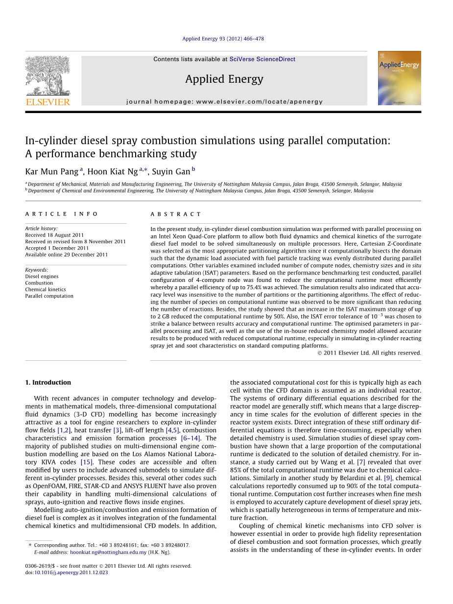 在现在的研究中,用因特尔至强四核处理器来演示柴油机缸内燃烧的模拟用流体力学和化学动力学代替柴油机燃油模型在多任务处理器上同时解决。在文章中,笛卡尔的Z坐标被选为最合适的分割算法,因为例如有关燃油颗粒运动轨迹的动态负荷的计算的分割领域在并行计算时被均等平分。其他的实验变量包括计算节点的数目,化学的型号,非结构化自适应列表法的参数。基于被引导的基准实验现象,发现4计算节点的并行结构通过最高可达75.4%的并联效率能最高效的减少计算运行时间。仿真结果还表明,精度级别对分区数或分区算法不敏感。减少计算运行时间的物种数量比减少反应次数更为显着。此外,研究表明,ISAT最大存储容量增加到2GB使计算运行时间减少了50%。此外,选择10-3的ISAT容差是为了在结果准确度和计算运行时间之间取得平衡。在并行处理和ISAT中优化的参数以及内部简化化学模型的使用允许精确的结果以减少的计算运行时间,特别是在标准计算平台上模拟缸内反应喷射和烟尘特性。
