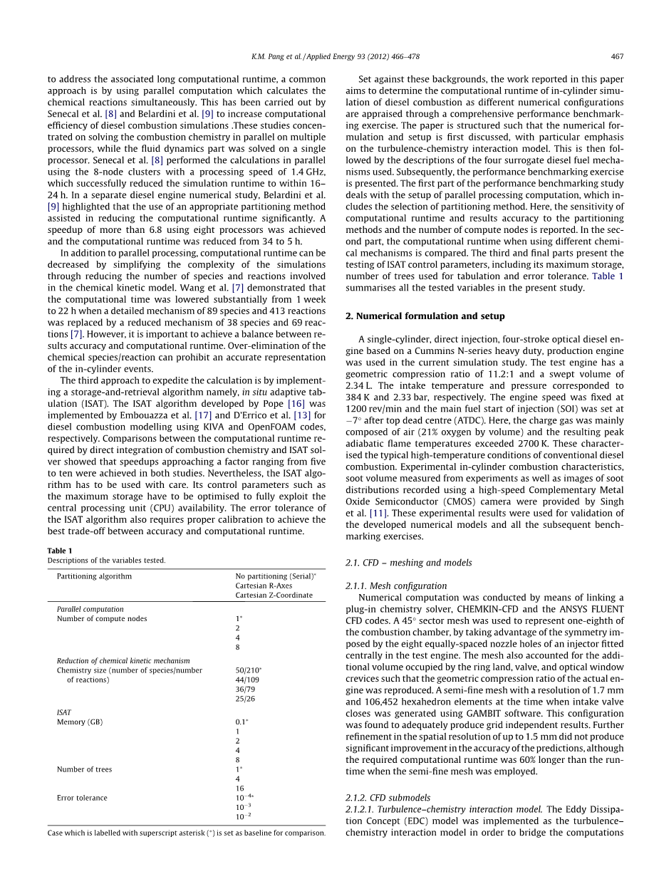 针对这些背景,本文报道的工作旨在确定柴油机燃烧缸内模拟的计算运行时间,因为不同的数值配置是通过综合性能基准测试来评估的。本文的结构是数值表达和设置是首先进行了讨论,特别强调了湍流 - 化学相互作用模型,接着对四种替代柴油机理进行了描述,其次介绍了性能基准练习。第一部分性能基准研究涉及并行处理计算的设置,其中包括分区方法的选择。这里给出了计算运行时间和结果精度对分区方法和计算节点数量的敏感性。第二部分是计算运行时当使用不同的化学机制进行比较。第三和最后部分提出了ISAT控制参数的测试,包括其最大存储量,用于制表的树的数量和容错能力。表1总结了本研究中的所有测试变量。