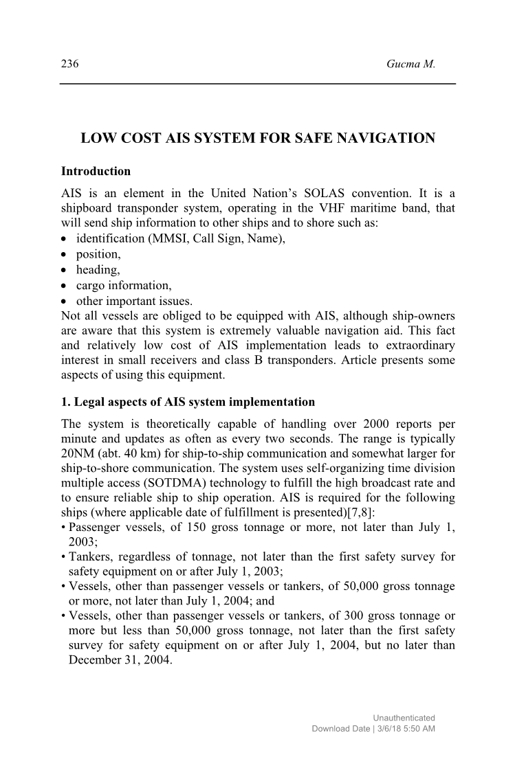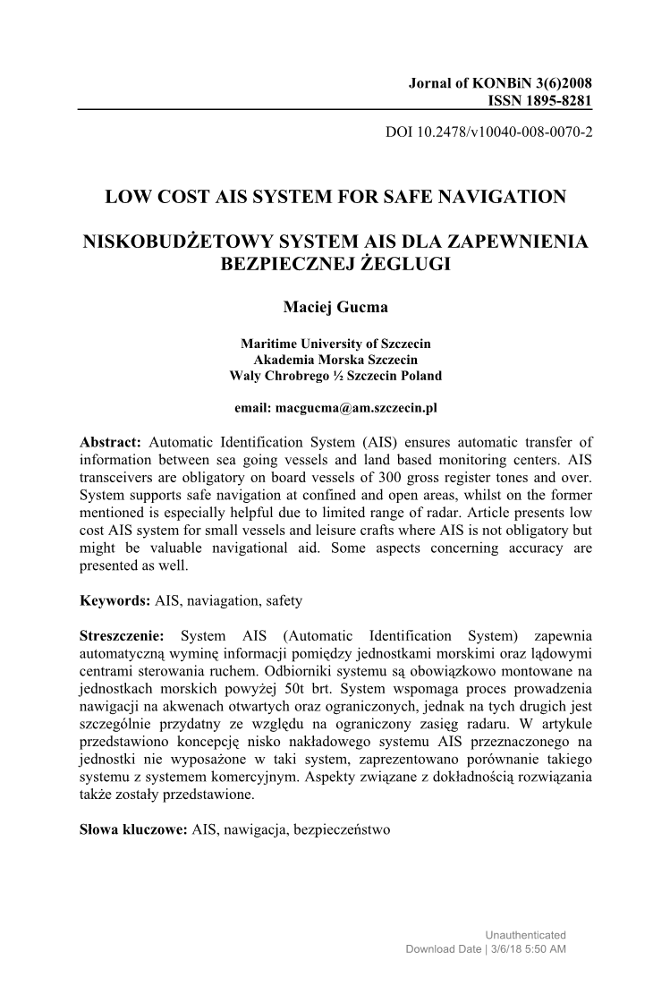 文摘:自动识别系统(自动识别系统)保证了海上航行船舶和陆地监测中心之间信息的自动传输。自动识别系统收发器在登记总吨位三百吨及以上的船舶上是强制性安装的。系统支持在封闭和开放区域内的安全航行,而在前面提到的,由于雷达的范围有限,所以它特别有用。文章介绍了小型船舶和旅游船的低成本自动识别系统的安装不是强制性的,但可能是有价值的导航设备。还提出了一些有关精度的问题。