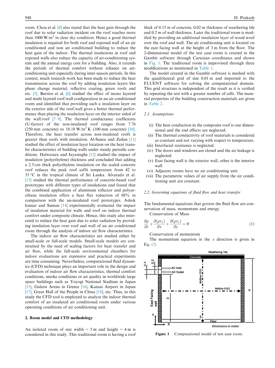 在许多建筑物获得热量的来源中,太阳辐射被认为是提高室内温度的主要因素。入射的太阳能被地表吸收为51%,反射4%;大气和云层吸收19%,分别反射26%。Vijayakumar等人指出,建筑物屋顶的热量传输约占房间总热量的50 - 70%。Chou等人还指出,在晴朗的天空条件下,屋顶上的太阳辐射产生的热量达到每平方米一千瓦。因此,空调和非空调建筑的屋顶和外墙都需要良好的隔热,以减少室内的热辐射。屋面和外墙的保温隔热也降低了空调系统的容量和建筑的年能耗。同时,特别是在季节间,它扩展了热舒适的时间而不依赖空调。在项研究中,许多研究工作已通过增加绝缘层,如相变材料,反射涂层,屋顶绿化等,以减少屋顶上的热量传输。巴里奥斯等人研究了单层和多层屋顶/墙壁结构在空调房间中的作用,并确定在屋顶/墙壁外部提供这样的保温层比在墙壁/屋顶的内侧放置绝缘层有更好的热性能。热传导系数(U值)的非保温屋面的范围从7.76(250毫米混凝土)到18.18 W/M2 K(100毫米混凝土)。因此,非绝缘屋顶传热大于屋面保温。Al Sanea Zedan 研究了绝缘层位置对建筑墙体稳态周期条件下的换热特性的影响。Halwatura和Jayasinghe研究了厚度对绝缘的影响(聚乙烯),认为加入一个2.5厘米厚的聚乙烯绝缘对大型混凝土屋面降低峰顶底温度在斯里兰卡的热带气候从42℃降到33℃。Alvarado等人研究了不同类型的绝缘混凝土屋顶原型的热性能,并发现铝反射器和聚氨酯绝缘的组合应用提供了一个与非绝缘屋顶原型相比热通量减少88%的方法。Ashok kumar和Suman实验证明了复合气候条件下墙体和屋面保温材料对室内热舒适性的影响。因此,本研究亦希望透过室内气流特性分析,提供一个空调室屋顶和墙壁的隔热层,以减少太阳辐射引起的热增益。