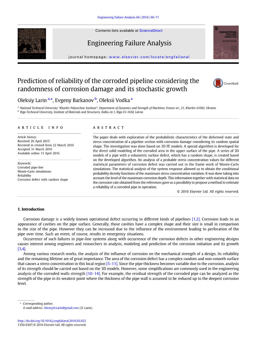这项工作涉及考虑其随机空间形状的腐蚀损伤的管段的变形状态和应力集中的概率特征的探索。 调查是基于3D有限元模型完成的。 已经开发了一种用于构造具有随机形状的VSD的管道模型的算法,其允许进行Monte-Carlo模拟以分析腐蚀损伤的不同统计参数的可能应力集中值。 这项工作提出了一种基于管道内应力状态的概率特性的有限元模拟和固定内部压力下管道腐蚀速率的统计数据来估算正在运行的腐蚀管道的可靠性的方法。