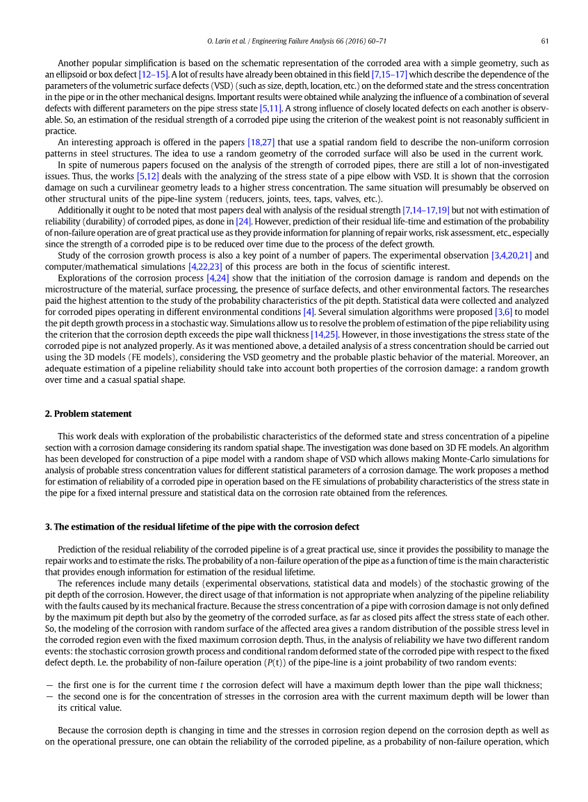 对腐蚀过程的探索[4,24]表明腐蚀损伤的发生是随机的,取决于材料的微观结构,表面处理,表面缺陷的存在以及其他环境因素。研究成果对坑深度概率特性的研究给予了高度重视。收集统计数据并分析在不同环境条件下运行的腐蚀管[4]。提出了几种仿真算法[3,6],以随机的方式对坑深度增长过程进行建模。模拟使我们能够使用腐蚀深度超过管壁厚度的标准来解决管道可靠性估计问题[14,25]。然而,在这些调查中,腐蚀管的应力状态没有得到适当的分析。如上所述,考虑到材料的VSD几何形状和可能的塑性行为,应使用3D模型(有限元模型)对应力集中进行详细分析。此外,对管道可靠性的充分估计应该考虑腐蚀损伤的两个性质:随时间的随机增长和不规则的空间形状。