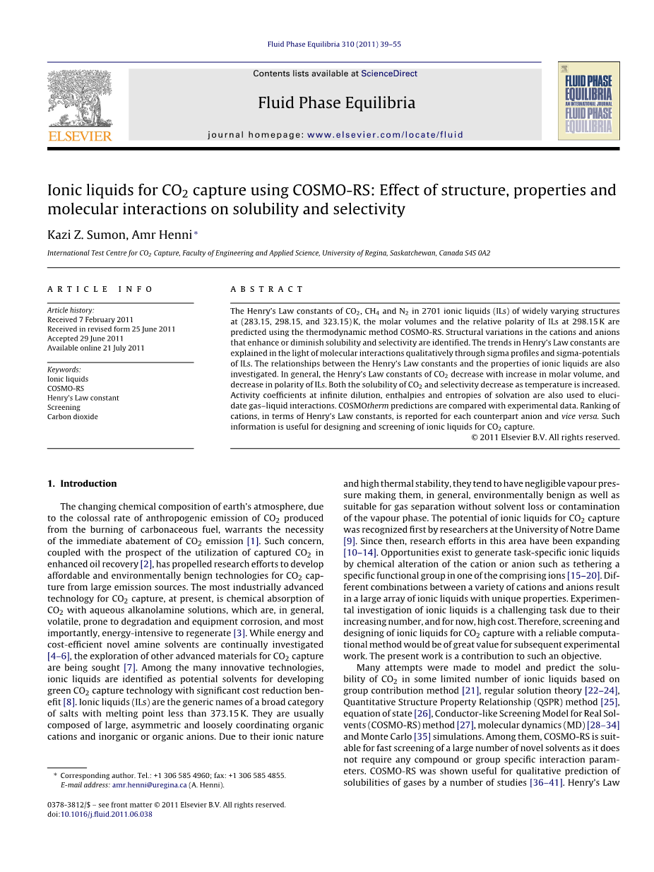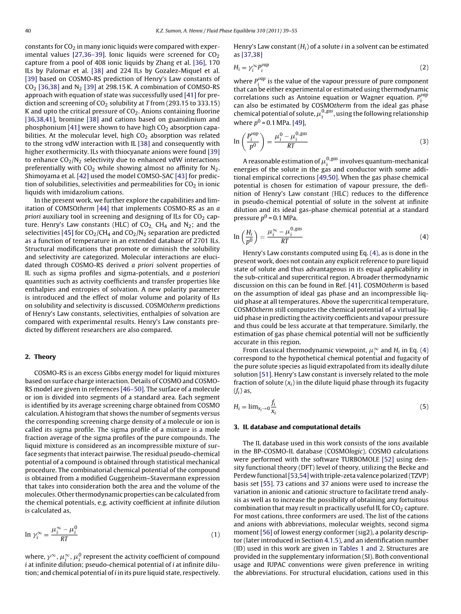 由于它们的离子性质和高热稳定性,它们往往具有可忽略的蒸汽压力,使它们在一般情况下是无害环境的,也适用于无溶剂损失或气相污染的气体分离。诺特丹大学的研究人员首先确认了离子液体对二氧化碳捕获的潜力。 [9]. 自那以后,该领域的研究工作一直在扩大。 [10–14]. 通过对阳离子或阴离子的化学变化(如在其中一个包含的离子上的一个特定的官能团)的化学变化,可以产生特定的离子液体。 [15–20].不同的阳离子和阴离子的不同组合会产生一大批具有独特性质的离子液体。离子液体的实验研究是一项具有挑战性的任务,因为它的数量越来越多,而且目前成本很高。因此,用可靠的计算方法对离子液体进行CO2捕获的筛选和设计将对后续的实验工作有很大的价值。目前的工作是建设这一目标。在有限数量的离子液体中,根据基团贡献法,对二氧化碳的溶解度进行了建模和预测[21],一般溶液理论 [22–24], 定量结构属性关系(QSPR)方法[25], 状态方程 [26], 实际溶剂(cosmor - rs)方法的电导式筛选模型。 [27],分子动力学(MD)[28–34] 和蒙特卡罗[35] 模拟. 其中,cosmor - rs适用于快速筛选大量的新型溶剂,因为它不需要任何化合物或组特定的相互作用参数。通过一系列研究,cosmor - rs对气体溶解度的定性预测是有用的。[36–41]. 在许多离子液体中,亨利定律常数常与实验值相比较。[27,36–39].通过Zhang等人对408离子液体池中CO2的捕获进行了离子液体的筛选。通过Zhang等人对408离子液体池中CO2的捕获进行了离子液体的筛选。 [36], 170离子液体由Palomar等筛选, [38]Gozalez-Mique等筛选224离子液体[39]基于cosmor-rs预测的亨利定律常数CO2[36,38]和N2[39]在298.15K。