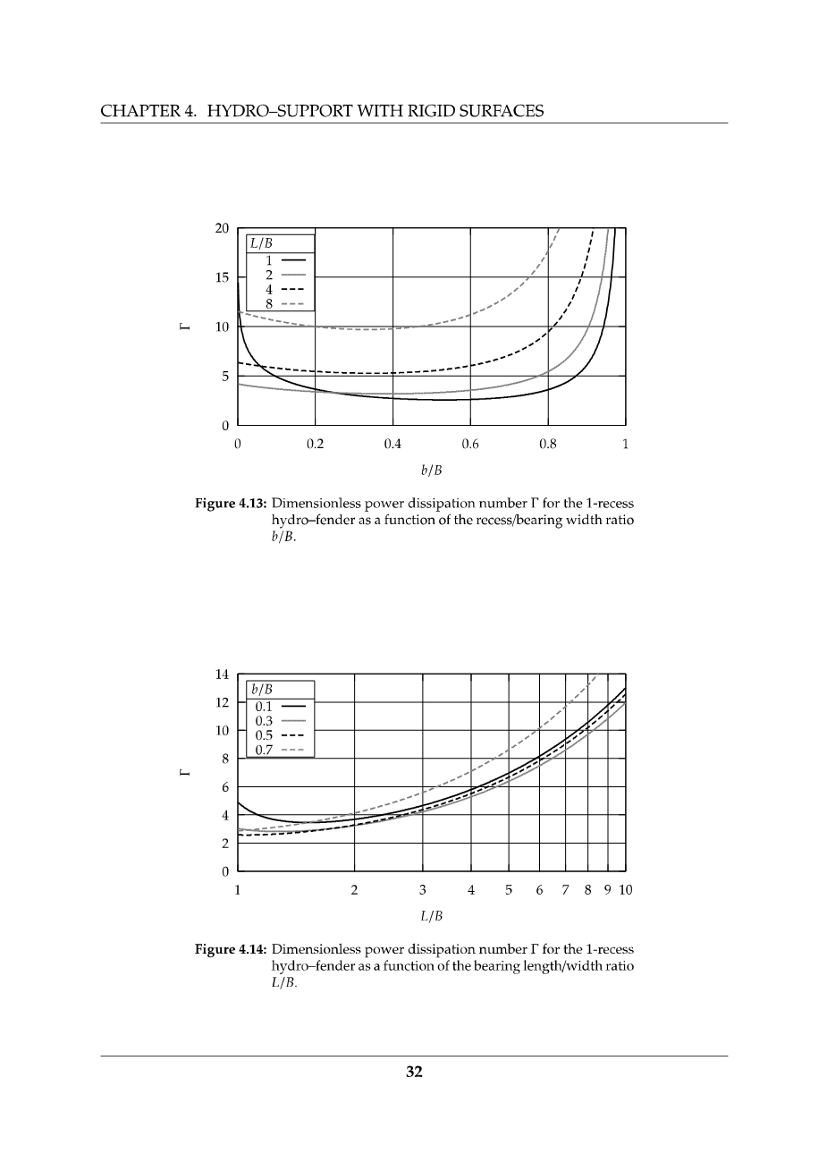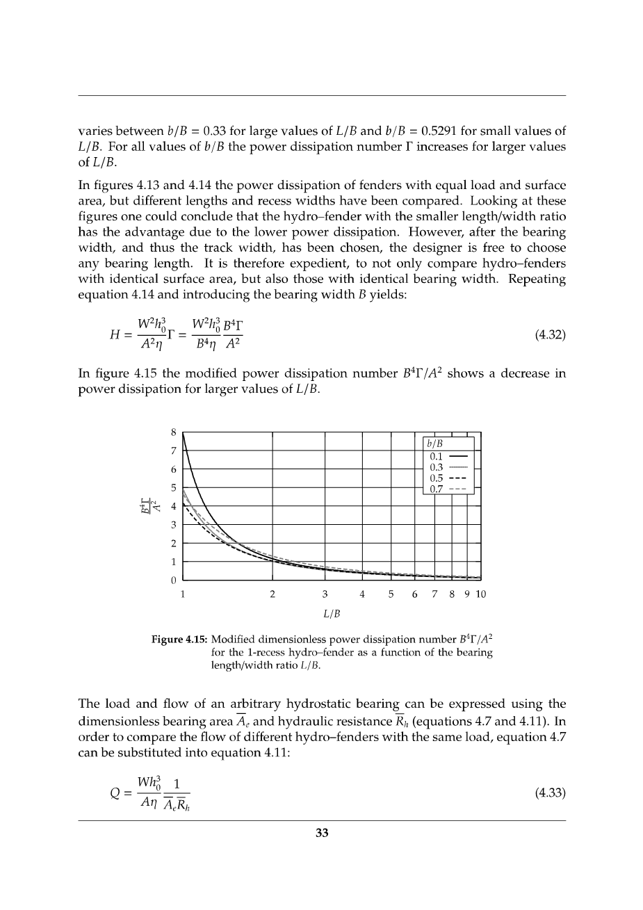 在图4.13和4.14中,瓦块的功率耗散是在相同负荷、相同表面积,不同的长度和凹槽宽度的情况下进行比较的。从图中可以看出,具有更小长宽比的瓦块更有优势,因为这意味着更低的功率耗散。然而,轴承的宽度确定之后,进而凹槽的宽度也就确定了,但设计者仍可以自由的选择轴承的长度。因此这只是一个权宜之计,不仅在相同的表面积下比较,而且也在相同的轴承宽度下比较。重新推导等式4.14并引入轴承宽度B进行替换: