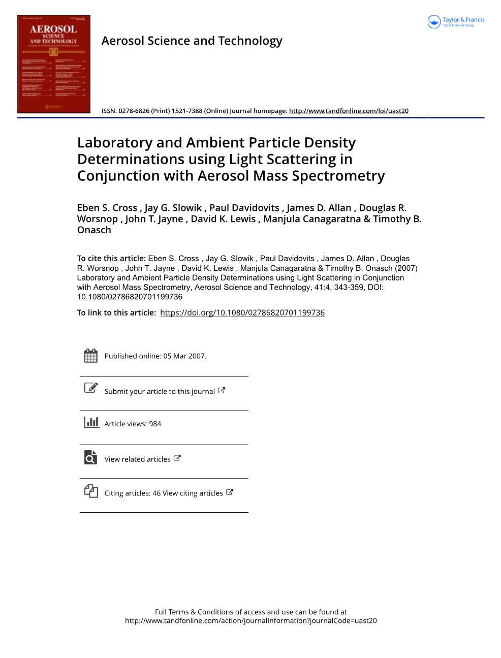 当与DMA联用时,气溶胶质谱仪可以根据dm和dva的关系测得颗粒密度。SPLAT-MS已经为了高精度测量实验室产球形颗粒密度(Zelenyuk et al. 2005)和实验室非球型颗粒的有效密度(Zelenyuk et al. 2006a)而采取这样的方法。在我们先前的研究当中,我们得到了通过DMA得到了dm,利用重航空器气溶胶质谱仪测量dm,从AMS中获得颗粒飞行时间,并且得到了利用被校准过的AMS所测量得到的mp(具体细节可以参考DeCarlo et al.2004 Slowik et al. 2004)和因为进行着各种各样化学反应的球形颗粒密度的变化(Katrib et al.2005)。在这些研究中,我们是通过已知实验室气溶胶颗粒整体的平均粒径(dm和dva)来确定颗粒密度的。
