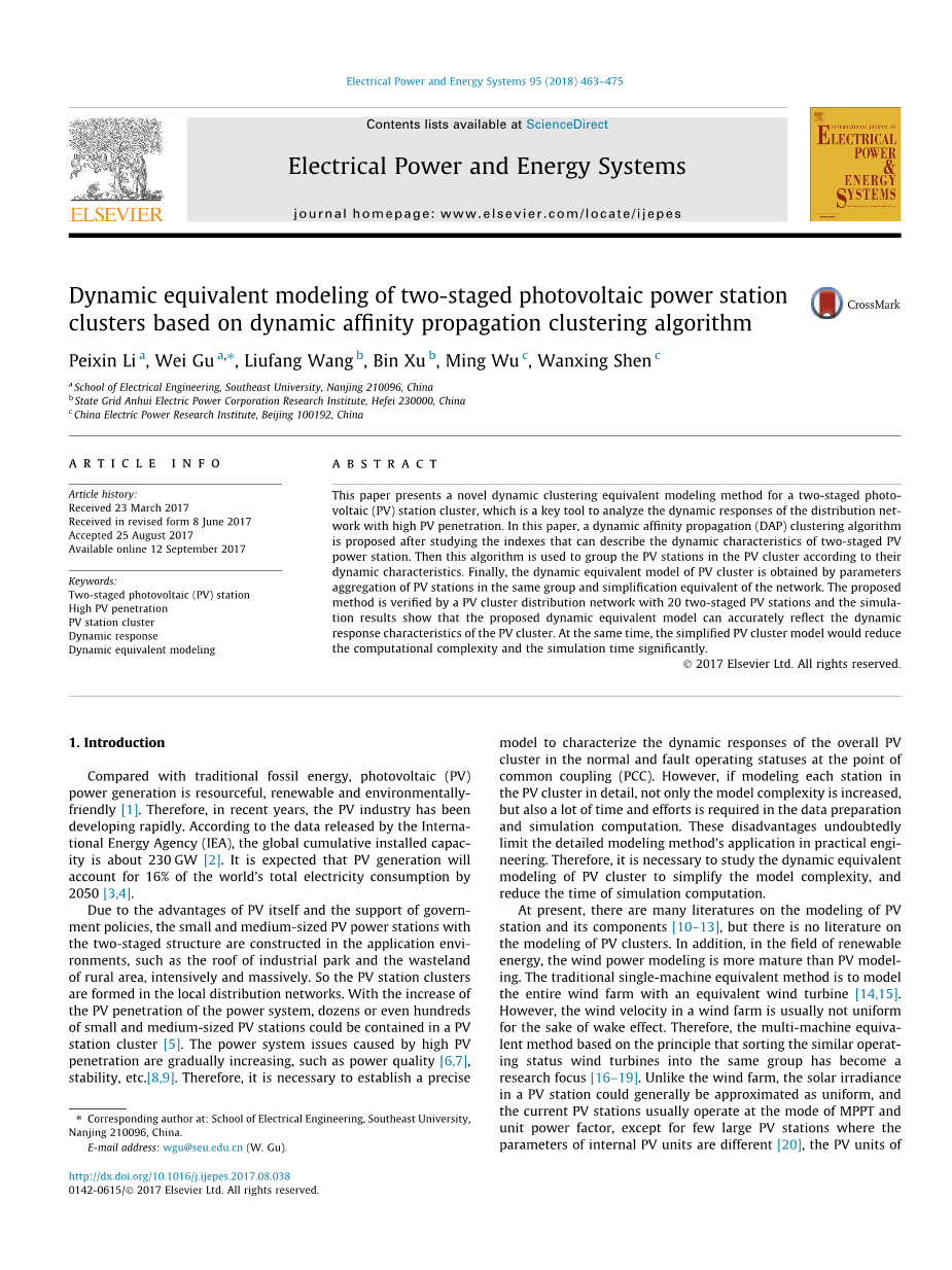 本文提出了一种新型的两级光伏(PV)站群的动态聚类等效建模方法,该方法是分析高光伏入口配电网动态响应的关键工具。本文在研究可描述两级光伏电站动态特性的指标后,提出了一种动态亲和传播(DAP)聚类算法。然后根据这些算法的动态特性将该算法用于PV集群中的光伏电站分组。最后,通过同一组内光伏电站的参数聚合和网络简化等效,得到光伏电池组动态等效模型。该方法通过一个具有20个二级光伏电站的光伏集群配电网络进行了验证,仿真结果表明所提出的动态等效模型能准确反映光伏电站的动态响应特性。同时,简化的PV群集模型将显着降低计算复杂度和模拟时间