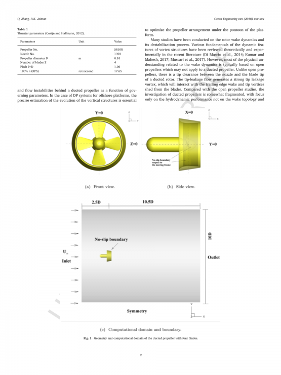 本文对转子尾迹动力学及其失稳过程进行了大量的研究。近年来的文献从理论和实验两方面对涡流结构动力学特性的各种基础进行了综述(Di Mascio等人,2014;Kumar和Mahesh,2017;Muscaritial.,2017)。然而,大多数与尾流动力学相关的物理理解通常基于开放式螺旋桨,这可能不适用于导管螺旋桨。与开放式螺旋桨不同,导管转子的喷嘴和叶尖之间有一个叶尖间隙。叶尖泄漏流产生一个强烈的叶尖泄漏涡,它将与后缘尾迹和叶片产生的叶尖涡相互作用。与开放式螺旋桨研究相比,导管螺旋桨的研究有点零散,只关注水动力性能,而不关注尾流拓扑结构和涡流结构。关于导管螺旋桨尾流的一些研究综述如下。