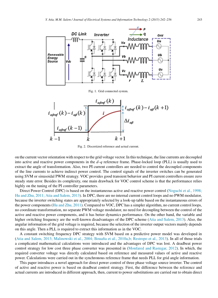 直接功率控制(Dpc)是基于瞬时有功和无功功率控制(Noguchi等人,1998年;Hu和朱,2011年;Atia和Salem,2013年)。在DPC中,没有内部电流控制回路,也没有PWM调制器,因为逆变器的开关状态是由基于功率分量瞬时误差的查表(Hu和朱,2011)适当选择的。该方法算法简单,无电流控制回路,无坐标变换,不需要单独的pwm电压调制器,不需要有功和无功功率元件的解耦控制,具有较好的动态性能。另一方面,可变和高开关频率是dpc方案众所周知的缺点(atia和salem,2013),另外,由于选择了电网电压的角度信息。逆变器的输出矢量主要依赖于这个角度,因此需要PLL来提取这些信息,就像在VOC中那样。