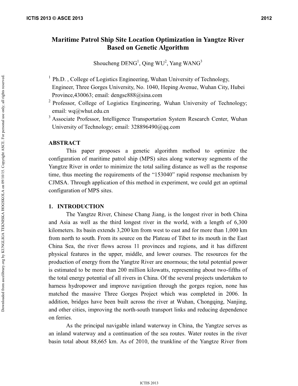 - Ph.D. , College of Logistics Engineering, Wuhan University of Technology, Engineer, Three Gorges University, No. 1040, Heping Avenue, Wuhan City, Hubei Province,430063; email: dengsc888@sina.com