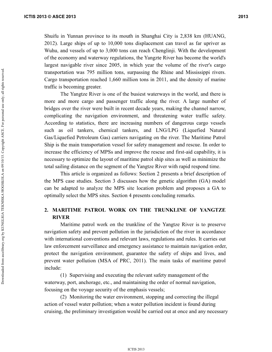 越来越多的货物和越来越大的客运量使长江成为世界上最繁忙的水路之一。近十年来,在长江上修建了大量的桥梁,使河道变得狭窄,使航运环境复杂化。江上船舶交通流量也随之快速增加,船舶吨位大型化、运输专业化和航速等不断提高,另外水面危险品运输船舶数量的增加,使得水面辖区的通航环境更加复杂,并威胁到水上交通安全。据统计,有越来越多的危险货物船只,如油轮、化学品油轮和LNG/LPG(液化天然气/液化石油气)船在这条河上航行。作为内河航运船舶管理者的地方海事部门,近年来在提高人员素质、更新船舶装备和完善法律法规上取得的成绩是有目共睹的,但是还难以有效运用现代化的装备和手段去进行管理,仍主要依靠海巡艇在现场开展工作。海上巡逻船是安全管理和救援的主要交通工具。为了提高MPSs的效率,提高救援和急救能力,有必要优化海上巡逻船站点的布局,最大限度地减少长江段的总航行距离,对提高海事巡航执法的效率,增强水上抢险救援和海事巡逻能力,显得尤为重要。